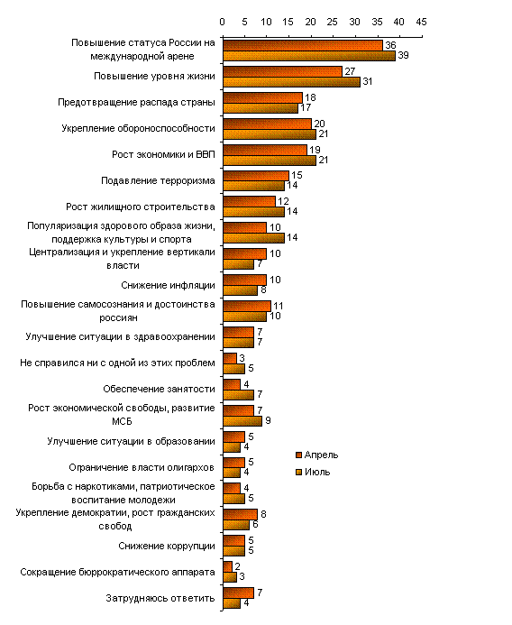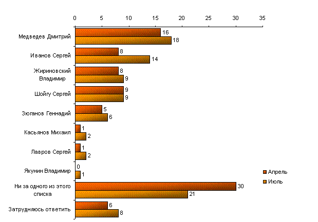 Дмитрий Медведев по-прежнему лидирует в предвыборном рейтинге РомирРомир представляет результаты июльского исследования политических настроений россиян. В опросе, проведенном с 6 по 12 июля в рамках очередной волны ежемесячного общероссийского омнибуса, приняло участие 1605 респондентов в возрасте от 18 лет и старше. Статистическая погрешность не превышает ±2,4%. Вопрос: Если бы в следующее воскресенье состоялись выборы Президента РФ, за кого бы Вы проголосовали? Мнения % Выборка: 1418 респондентов ![]() Если сравнить результаты исследования политических настроений россиян, проведенного в июле, с апрельскими данными, то можно усмотреть тенденцию к снижению числа граждан, не отдавших свой голос ни одному кандидату из представленного списка. Практически треть респондентов, опрошенных весной, не стали бы голосовать ни за одну из предложенных персон, тогда как в июле их число приблизилось к 21%. Явных изменений в позициях политических фигур не наблюдается: Дмитрий Медведев по-прежнему остается лидером в предвыборном рейтинге Ромир. 18% опрошенных отдали свой голос в его пользу, что на 2% больше, чем в апреле. В роли Президента РФ его видят чаще, чем остальные интервьюируемые, жители Поволжья (13%) и россияне, живущие в городах с населением от 500 тысяч до одного миллиона человек (10%). Первый вице-премьер пользуется примерно одинаковой поддержкой со стороны разных социальных групп населения, независимо от пола, возраста, образования, дохода и семейного положения респондентов. Второе место, как и ранее, занимает Сергей Иванов (14% против апрельских 10%). Третье – лидер ЛДПР Владимир Жириновский (9% против апрельских 8%). Вопрос: Через год истекает срок полномочий Владимира Путина на посту Президента России. Назовите, пожалуйста, три проблемы, с решением которых, на Ваш взгляд, Владимир Путин справился лучше всего. Мнения % Выборка: все респонденты ![]() Согласно результатам исследования, в первую тройку проблем, которые, по мнению участников опроса, удалось решить нынешнему Президенту РФ на своем посту, вошли: повышение статуса России на международной арене – более трети опрошенных (39%) в июле (36% в апреле) считают, что Путину удалось решить именно этот вопрос лучше всего. Второе – это повышение уровня жизни народа, рост заработной платы и пенсии (31%). Третье – укрепление обороноспособности страны (21%) и рост экономики и ВВП (21%). Вторую группу составляют: предотвращение распада страны, подавление терроризма, рост жилищного строительства, популяризация здорового образа жизни. Каждый из этих пунктов отмечают от 11 до 17% россиян. Третью группу образуют решенные проблемы с рейтингом от 5 до 10% каждая. Это централизация и укрепление вертикали власти, снижение инфляции, повышение самосознания и достоинства россиян, улучшение ситуации в здравоохранении, обеспечение занятости, рост экономической свободы, а также укрепление демократии и рост гражданских свобод. На последних местах оказались (5% и менее): улучшение ситуации в образовании, ограничение власти олигархов, борьба с наркотиками, снижение коррупции и сокращение бюрократического аппарата. Отметим, что в июле набралось чуть больше респондентов, чем в апреле, решивших, что Путин не справился ни с одной из представленных в списке проблем (5% против апрельских 3%). При этом практически три четверти опрошенных (75%) 
