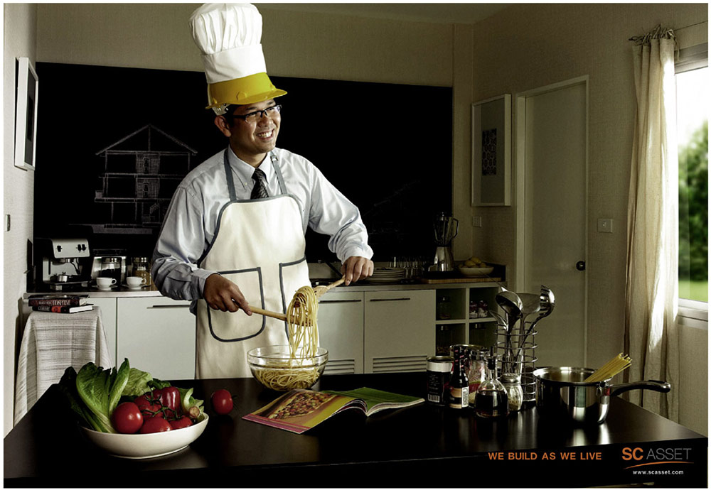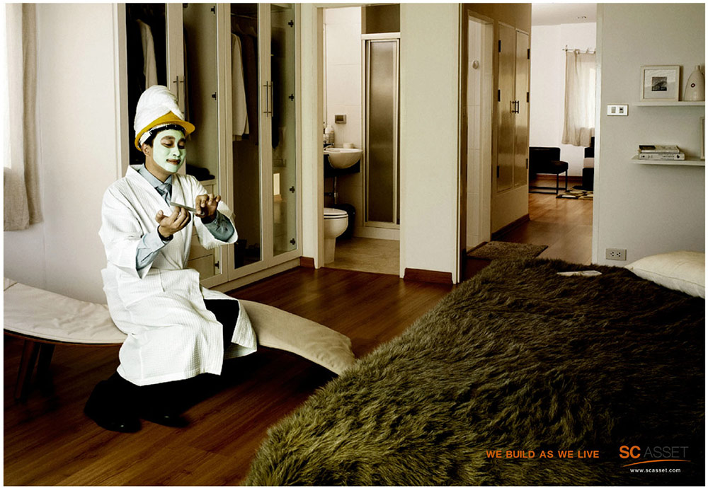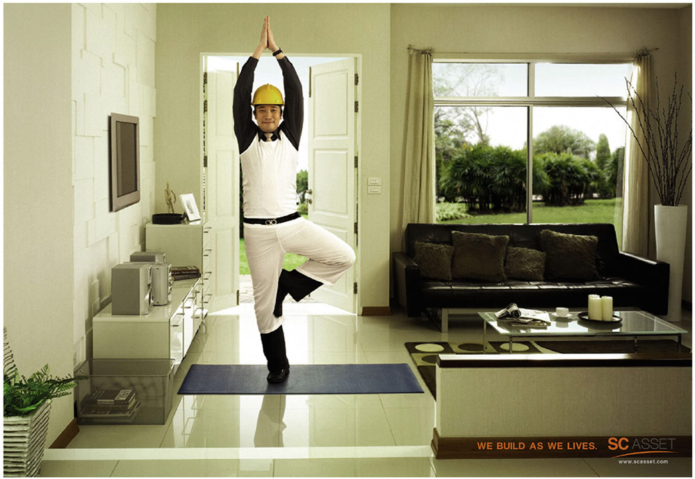 Строители SC Asset сами тестируют новые домаКомпания SC Asset - это строительная конструкторская компания, которая создает жилище самого высокого класса. По эти рекламным плакатам мы ожжем судить, как строители относятся к своей работе: строя дом, они стремятся, чтобы жильцам было удобно, и проверяют все на себе: занимаются в новом доме йогой, готовят еду или делают маникюр в ванной. Надпись: "Мы строим так, как мы живем. SC Asset" |
