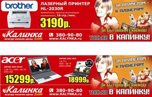 Компания "Калинка" запустила очередную рекламную кампанию "За примером - к пионерам, за бытовой техникой - только в Калинку!". В качестве основных каналов коммуникации были использованы стикеры, которые можно наблюдать в вагонах метро с 13 августа, а 20 августа вышла сетевая газета "Калинка" тиражом 810 000 экземпляров. Так же с 13 августа продавцы-консультанты "Калинки" вспомнили пионерское детство и, в поддержку акции, повязали себе пионерские галстуки. В гипермаркетах сети были размещены плакаты формата А4 с лозунгом "За примером - к пионерам, за бытовой техникой - только в Калинку!". Акция "За примером - к пионерам, за бытовой техникой - только в Калинку!" планировалась заранее и являлась частью единой кампании сети магазинов "Калинка", которая началась в январе 2007 года под лозунгом "За снегом в Альпы, за бытовой техникой только в Калинку!". Продолжением кампании стала реклама со слоганами "За мужчиной на границу" к 23 февраля, "За женщиной в ЗАГС" к 8 марта и "За свиньями - на ферму, за бытовой техникой - только в Калинку!" в апреле и т.д.