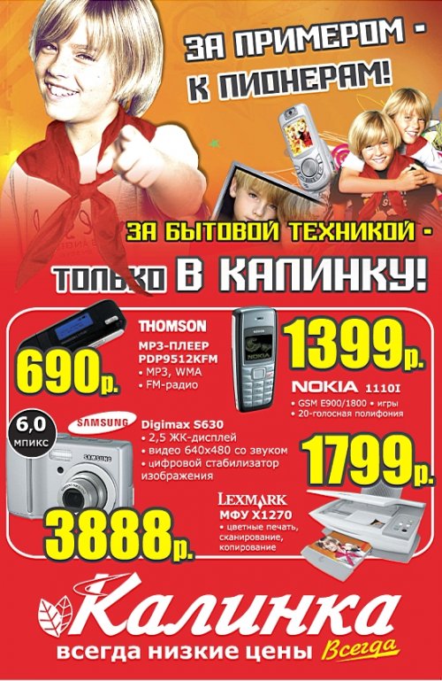 "В создании этой рекламы "Калинка", безусловно, была пионером, поскольку еще 2 августа нами были получены от рекламного агентства пионерские галстуки, в которых продавцы-консультанты вышли на работу во всей сети, включая региональные магазины. Тогда же были оформлены плакатами торговые залы. 17 августа вышла сетевая газета с лозунгом "За примером - к пионерам, за бытовой техникой - только в Калинку!", были размещены стикеры в метрополитене с тем же лозунгом", - заявила финансовый директор "Калинки" Мария Борисова.
