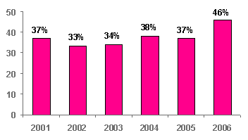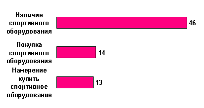 Спортивное оборудование дома имеют 46% казахстанцевКрасота человеческого тела еще с эпохи античности является одной из главных тем искусства. Прекрасные статуи, великолепные полотна античности и ренессанса свидетельствуют о том, что человек во все времена стремился подчеркнуть красоту данную природой и по возможности совершенствовать ее своими силами прибегая к различным спортивным упражнениям и тренировкам. К тому же занятия спортом - это не только красота, но еще и здоровье. Сегодня существует множество различных средств и орудий для занятий спортом и поддержания физической формы. Это дает возможность человеку в домашних условиях и без особых усилий заниматься спортом.По данным исследования Media Marketing Index 1 (сентябрь 2006 года), проводимого компанией TNS GALLUP MEDIA ASIA, спортивное оборудование дома имеют 46% казахстанцев. Это на 9% больше по сравнению с 2005 годом (см. диаграмму 1). Диаграмма 1: Наличие спортивного оборудования. Динамика 2001-2006 гг. 1 По данным MMI 2006 - опрос проводился в 11 городах Казахстана с населением 200 тыс. и более, среди людей в возрасте от 15 лет и старше. Объем выборки составил 2500 респондентов. В 2006 году 14% казахстанцев приобрели спортивное оборудование (см. диаграмму 2). Причем наибольшее число людей покупали мячи, велосипеды и роликовые коньки. 13% опрошенных отметили, что планируют купить то или иное спортивное оборудование, например, спортивный тренажер планируют купить 4,1% респондентов, 2 % планируют купить велосипед и столько же мячи (см. таблицу 1). Диаграмма 2: Наличие, покупка и намерение купить спортивное оборудование. % Таблица 1: Наличие, покупка и намерение купить виды спортивного оборудования.