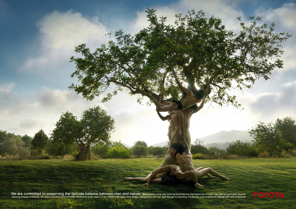 Единение человека с природой в рекламе ToyotaАвтомобильный концерн Toyota известен своими гибридными автомобилями. Создавая и улучшая их, он преследует единственную цель: "сохранение равновесия между человеком и природой". А этот рекламный плакат, созданный бельгийским агентством Dentsu, и сообщает ЦА, что делает Toyota ради единения человека с природой.Надпись: "Мы преданны сохранению равновесия между человеком и природой. Мы проделали длинный путь, с тех пор как выпустили наш первый гибридный автомобиль 10 лет назад. Но наша цель - это не только уменьшение выхлопной эмиссии. Мы применяем инновационные экологические решения каждого аспекта жизненного цикла транспортного средства: от проекта, изготовления и использования до переработки. Это - единственный способ достигнуть нашей окончательной цели: нулевой эмиссии топлива." Агентство: Dentsu, Брюссель, Бельгия Творческий директор: Roger Tavares Арт директор: Alexis Bellavoine, Moira Marcantei Копирайтер: Jan Vandeplas Фотограф: Christophe Gilbert Другое: Yannic LE COQ |