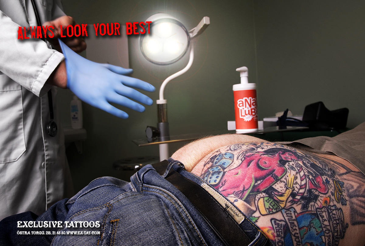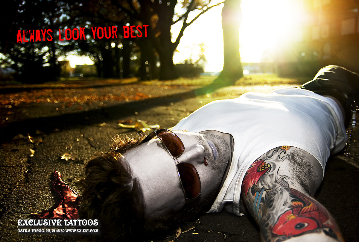 Татуировки от салона Exclusive Tattoos будут выглядеть круто даже на трупеВсегда выглядеть на все 100% призывает нас шведское агентство Troll, поможет нам в этом непростом деле салон татуировки Exclusive Tattoos. Ведь с татуировкой вы будете выглядеть круто в любой жизненной ситуации, например, когда проктолог собирается провести проверку, или даже когда вы умерли.Надпись: "Всегда выгляди наилучшим образом." Агентство: Troll, Карлстад, Швеция Творческий директор / Арт директор / Копирайтер: Robert Rundberget Фотограф: Robert Rundberget |