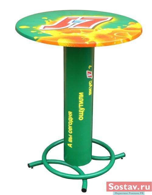 Барные столы J7 - POSM от "Визуальных технологий"Компания "Визуальные технологии" разработала и изготовила партию барных столов для торговой марки "J7". Барные столы "J7", выполненные в фирменных цветах бренда, относятся к категории POS-материалов и предназначены для проведения промо-акций и презентаций.Cтолешница из экологически чистого материала "werzalit" обладает повышенной прочностью, влаго- и термостойкостью. Полноцветное изображение наносится на столешницу в процессе производства по уникальной технологии, сохраняющей все свойства материала "werzalit". Это обеспечивает стойкость изображения к истиранию, делает его антивандальным. Основание стола - колонна выполнена из металлокаркаса, облицованного пластиковыми панелями с изображением, нанесенным методом шелкографии. Габаритные размеры: высота колонны 1 м., диаметр колонны - 0,2 м., диаметр столешницы - 80 см. Cтолы "J7" рассчитаны на длительный срок эксплуатации в любых условиях, в том числе, на открытых площадках. ![]() |