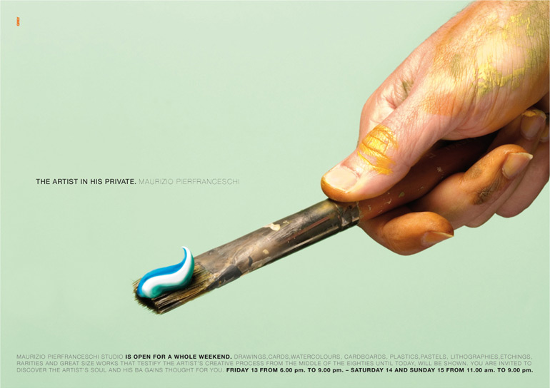 Агентство Grey: у художников особые зубные щеткиИтальянское рекламное агентство Grey, разработавшее этот плакат для галереи искусств Maurizio Pierfranceschi, открывает нам одну из сугубо конфиденциальных тайн художников: оказывается, что они настолько глубоко уходят в творческий процесс, что и зубы чистят кистью для краски.Надпись: "Художник в домашней обстановке. Maurizio Pierfranceschi." Агентство: Grey, Италия Главный творческий директор: Francesco Emiliani Арт директор: Daniele Freuli Копирайтер: Francesco Emiliani |
