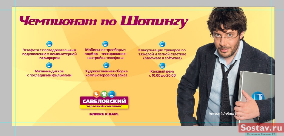 "Я подумал: а почему бы и нет?" Артемий Лебедев стал ведущим рекламного шоу20 августа стартовал осенний флайт рекламной кампании Торгового Центра "Савеловский". Идея рекламной кампании принадлежит креативному агентству Practica. Для ее визуализации была предложена концепция "Савеловский ближе к Вам", в которой звезды-эксперты в разных областях представляют "Чемпионат по шопингу в Савеловском". Все желающие могут принять участие в состязании: за удобное время и с любой суммой денег можно "выглядеть прекрасно", "подобрать игрушку как у лучшего друга" или "собрать идеальный суперсовременный компьютер". Именно Артемию Лебедеву "Савеловский" поручил представлять турнир на скоростную сборку ПК. Помимо гуру российского дизайна, рекламировать "Савеловский" согласились Саша Вертинская и Таша Строгая.