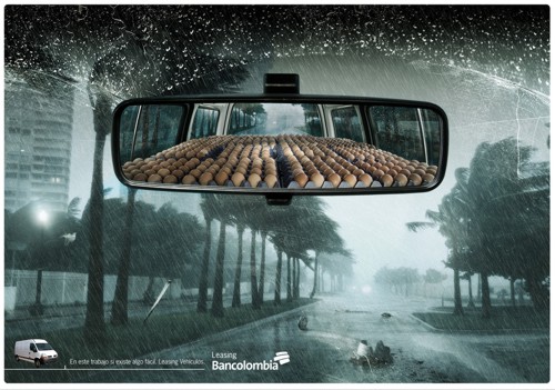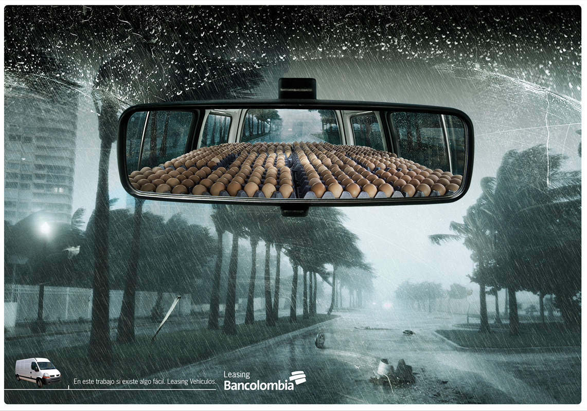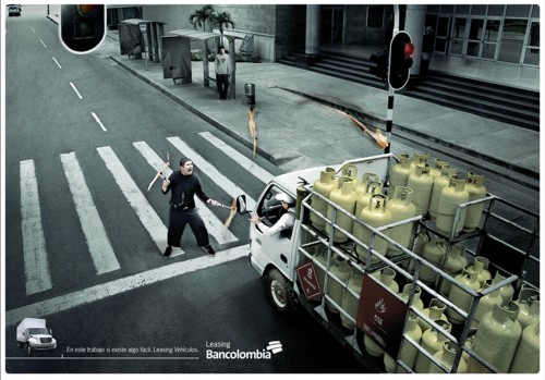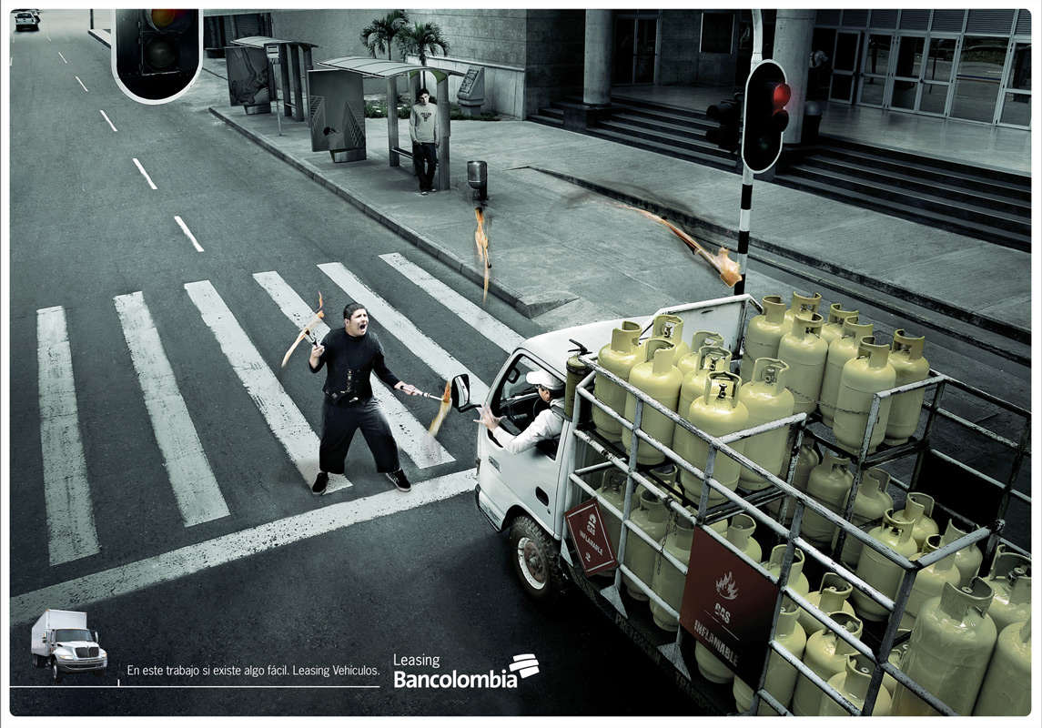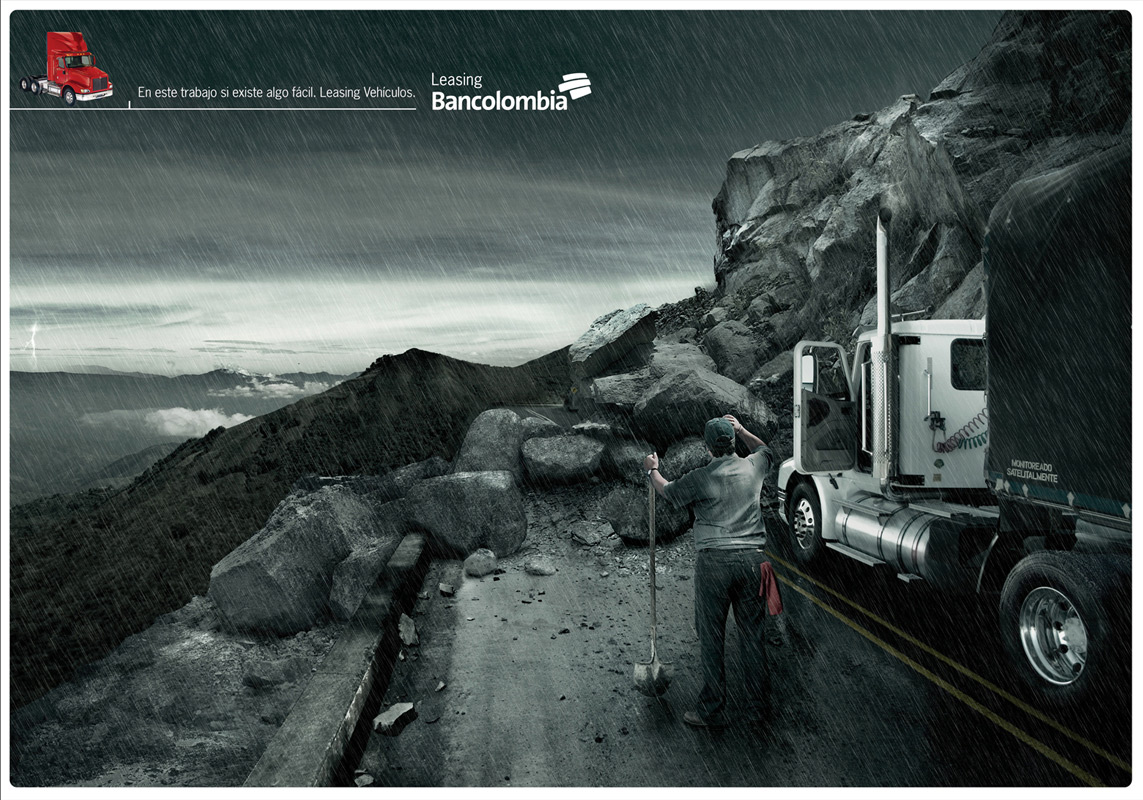 Нелегкая работа водителей в рекламе лизинга от банка BancolombiaРабота водителей грузовиков опасна и трудна, но есть в ней и легкие моменты, считает колумбийское рекламное агентство DDB Medellin, разработавшее эту кампанию. Одним из таких моментов является лизинг грузовиков в банке Bancolombia. А примеры трудностей и приведены на принтах: завал на дороге, жонглер огнем рядом с грузовиком, перевозящим газовые баллоны, или ураган во время перевозки яиц.Надпись: "На этой работе есть и легкие моменты. Лизинг грузовиков. Bancolombia" Агентство: DDB Medellin, Колумбия Творческий директор: Edgar Vergara Арт директор: Santiago Mesa Копирайтер: Alexandra Suarez Фотограф: German Rojas |