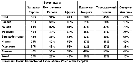 Любовь по-соседствуРомир, эксклюзивный представитель ассоциации Gallup International в России, принял участие в уникальном исследовании Voice of the People 2006, в ходе которого в период с июля по сентябрь 2006 года было опрошено около 60 000 человек из 63 стран мира. Их мнение репрезентирует взгляды более миллиарда жителей Земли. Согласно результатам опроса, мировое население относится положительно к большинству стран Большой восьмерки, с одним исключением – количество негативных мнений о России превышает количество позитивных отзывов. Крупнейшая азиатская страна Китай, также оцениваемая в этом исследовании, имеет сходные результаты. ![]() Более половины мирового населения (53%) положительно отзываются о Канаде, стране, получившей наибольшее количество позитивных оценок среди государств Большой восьмерки и Китая. На 7 процентных пунктов отстают от Канады такие страны, как США, Великобритания, Япония (46% положительных мнений), за ними следует Германия – 45%. Китай (32%) и Россия (31%) получили наибольшее количество негативных оценок. При этом 9% участников опроса о России высказались очень положительно и 17% - скорее положительно. Более трети опрошенных (36%) заявили о своем нейтральном отношении к нашей стране. Мнения о странах Большой восьмерки + Китай % положительных оценок по регионам ![]() Не обошлось также и без явных региональных отличий. Африка оказалась континентом с наиболее положительным отношением к странам Большой восьмерки, в то время как наибольшее количество отрицательных мнений об оцениваемых государствах (исключением оказалась Россия, к которой положительно относятся соседствующие страны) было получено в Восточной и Центральной Европе. Большее число положительных отзывов о США (после Северной Америки) было получено в Африке - 69%. С другой стороны, в странах Латинской Америки (38%) и Европы (31% положительных как в Западной Европе, так и в Восточной и Центральной Европе) уровень положительного отношения к США ниже среднемирового. Респонденты из Косово (87%) и Израиля (85%) выразили более позитивное отношение, чем граждане США. (77%). Наиболее негативно настроенными в отношении США оказались жители Турции (75%), Индонезии, Аргентины, Греции и Швейцарии (около 65% отрицательных отзывов). Позитивное отношение к России, как и следовало ожидать, активно демонстрирует население Восточной и Центральной Европы (54% положительных отзыва против 22% отрицательных). Наблюдается рост негативного отношения к нашей стране в Северной Америке (42%) и Западной Европе (40%). Интересно, что в Латинской Америке мнения разделились (21% положительных против 22% отрицательных). За пределами Восточной и Центральной Европы наиболее дружественно настроенными в отношении России странами оказались Индия и Вьетнам. Австрия, Финляндия, Чешская Республика, Косово и Турция относятся к России весьма негативно (во всех странах около 6-7 из 10 человек выразили отрицательное мнение). В Северной Америке были выявлены самые высокие показатели неприязненного отношения к Китаю – почти половина опрошенных (48%). Страны Западной Европы и Тихоокеанского региона также настроены весьма критично (36% и 35% негативных отзывов соответственно превышают количество положительных мнений). В Восточной и Центральной Европе мнения разделились в большей степени. Латинская Америка (в отличие от Африки, где положительно 