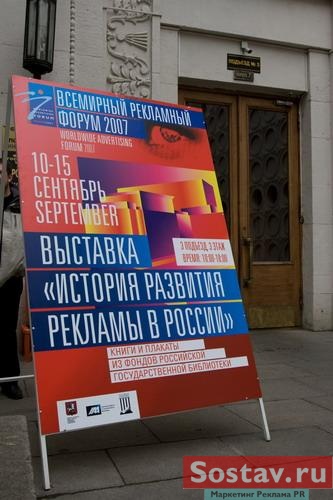 В Москве в Российской государственной библиотеке на Воздвиженке 10 сентября состоялась официальная церемония открытия выставки "История развития рекламы в России". Выставка проходит в рамках первого Всемирного рекламного форума. Уникальные экспонаты, среди которых раритетные дореволюционные, довоенные и доперестроечные издания о рекламе, как отечественные, так и иностранные, рекламные постеры, календари и энциклопедии, были любезно предоставлены фондами библиотеки. Современные работники рекламной индустрии немало могли бы почерпнуть полезного книг "Какъ сделъться хорошимъ продавцомъ, агентомъ, представителемъ", "Реклама и жизнь" (1921 г) и "Капиталистическая реклама и советский экспорт" (1931 г).