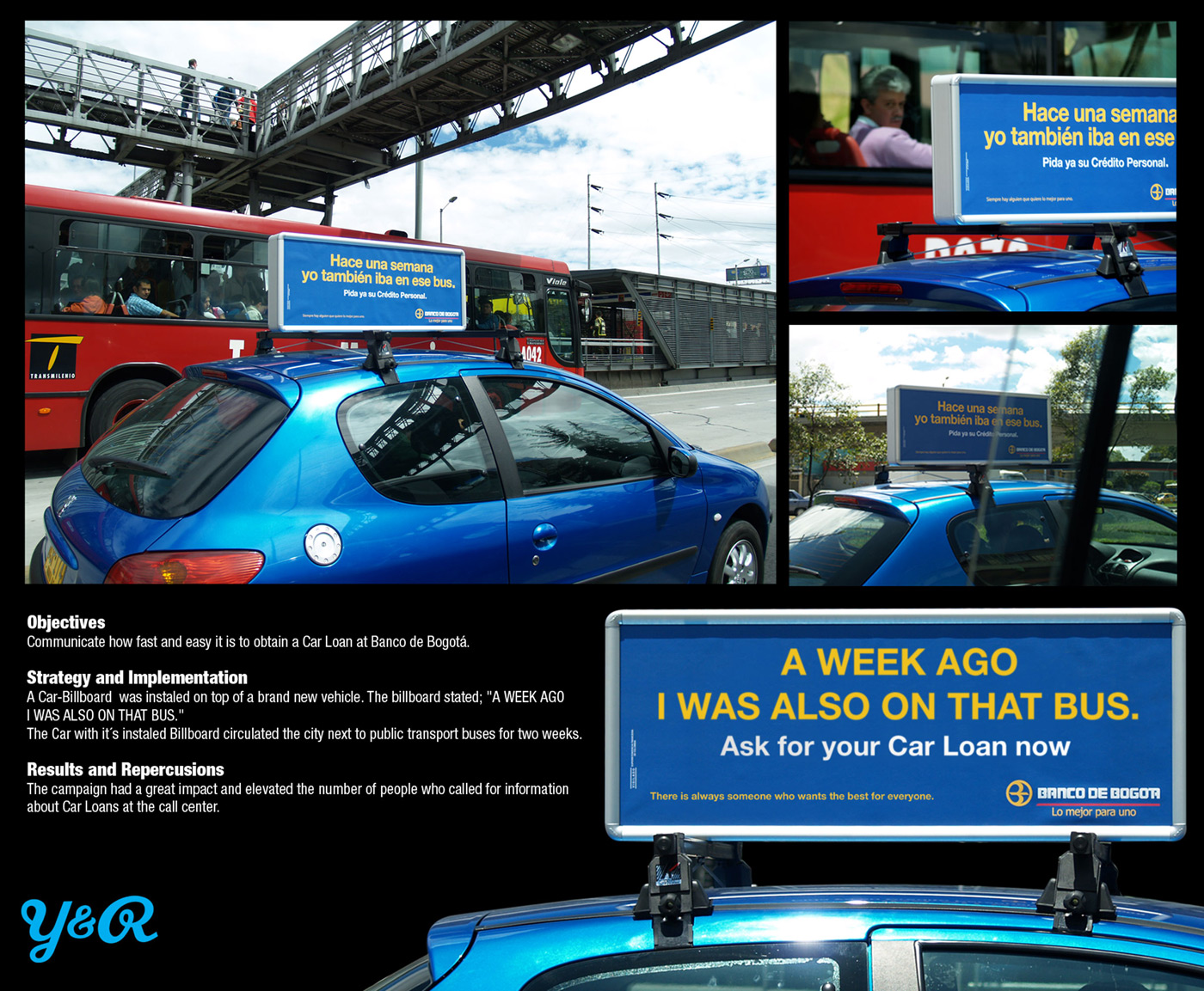 Рекламная кампания банка Banco de Bogota от агентства Young & RubicamАгентство Young & Rubicam Bogota разработало для колумбийского банка Banco de Bogota рекламную кампанию, вызывающую зависть простых пассажиров автобусов. На крышах нескольких автомобилей, разъезжающих по городу, был установлен щит с надписью "Неделю назад я тоже был в этом автобусе". Проезжая мимо такого автомобиля, пассажиры завидовали счастливому обладателю нового авто, и им предлагался кредит от банка.Надпись: "Неделю назад я тоже был в этом автобусе. Узнайте сейчас, как вы можете получить кредит на автомобиль." Агентство: Young & Rubicam Bogota, Колумбия Творческий директор: VP: Rafael Barthaburu, Victor Osorio Копирайтер: Fabi?n G?mez, Jorge Mill?n, Mauricio Due?as, Vladimir Silva Арт директор: David Arzayus Исполнительный аккаунт-менеджер: Carolina Delatorre |