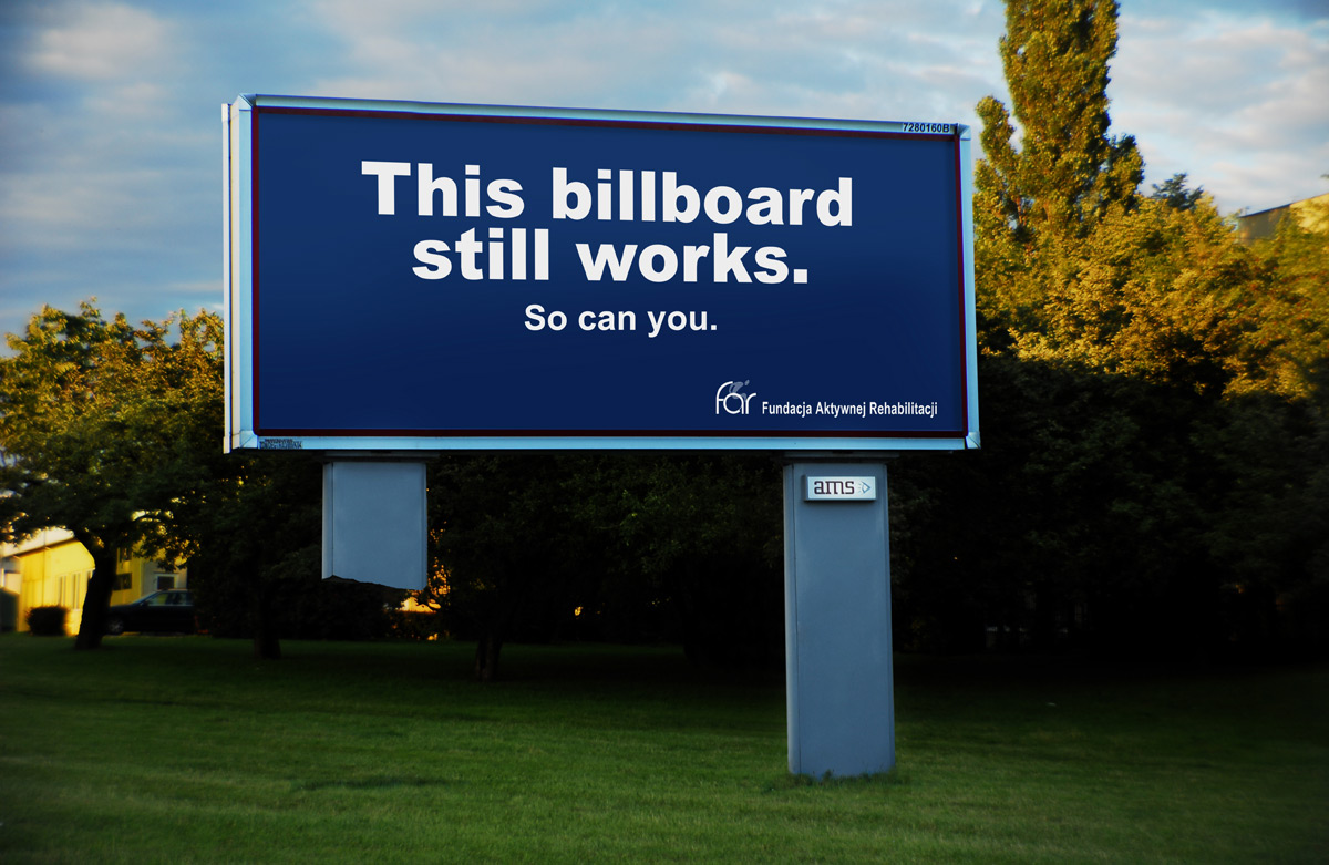 Щит-инвалид в социлке для Fundacja Aktywnej RehabilitacjiИнвалиды - не изгои общества, они могут жить и трудится как и все остальные люди. Именно эту мысль пытается донести до ЦА польское агентство TBWA, разработавшее этот рекламный щит для реабилитационного фонда Fundacja Aktywnej Rehabilitacji.Надпись: "Этот щит все еще работает. Ты тоже можешь" Агентство: TBWA, Варшава, Польша Творческий директор: Pawel Borowski Арт директор: Sunil Nair, malgorzata Koterba Копирайтер: Sunil Nair, Joanna Leszczynska |