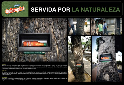 Деревья-автоматы по продаже напитков в рекламе QuintuplesПрохладительный напиток Quintuples изготовлен из натуральных ингредиентов, и, чтобы показать это, агентство ToroVazquezMora / Fischer America разработало оригинальную идею: с помощью специальных наклеек деревья превращались в автомат, по продаже напитков. Таким образом, создавалось впечатление, что напиток вываливается прямо из дерева.Надпись: "Подается природой" Агентство: ToroVazquezMora / Fischer America, Эквадор Творческий директор: Jaime Cueto, Fernando Franco, Jorge Cruz Арт директор: Fernando Franco Иллюстратор: Chang |
