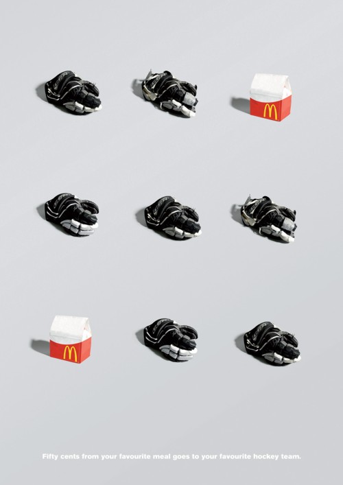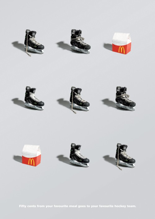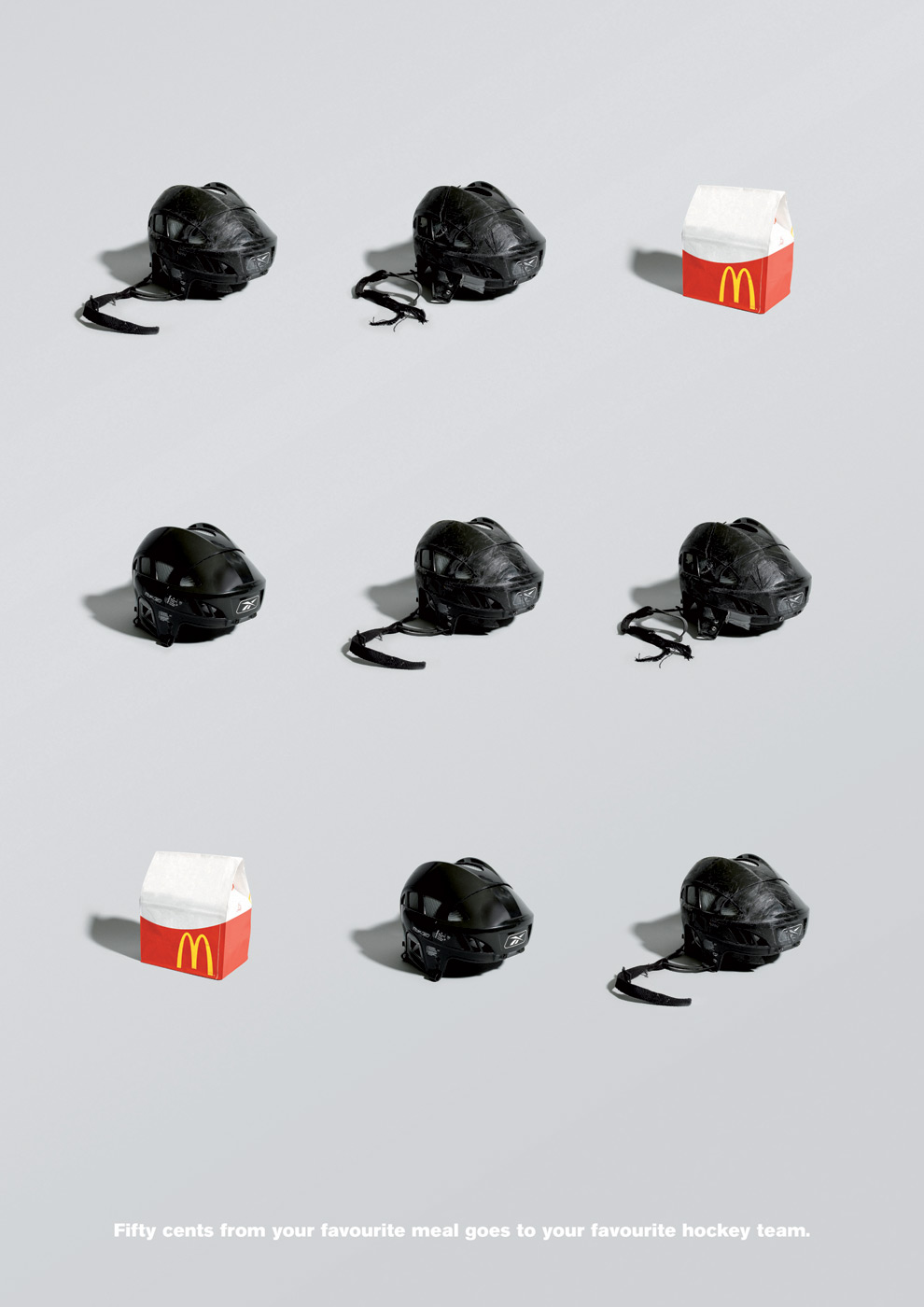 Агентство DDB Stockholm: еда McDonald's идет на экипировку хоккеистовЭта рекламная кампания, разработанная шведским агентством DDB Stockholm, рассказывает потребителям, что ресторан быстрого обслуживания McDonald's, кроме всего прочего, спонсирует хоккейные команды, давая деньги на обмундирование. А пока команда еще не полностью укомплектована экипировкой, в ее роли выступает еда из McDonald's.Надпись: "Пятьдесят центов от твоей любимой еды идет твоей любимой хоккейной команде." Агентство: DDB Stockholm, Швеция Творческий директор: Andreas Dahlqvist Копирайтер: Magnus Jakobsson Арт директор: Fredrik Simonsson Производство: Markus Hallgren Аккаунт-менеджер: Joachim Levin Ретушь: Johanna Karsten Фотограф: The Jens |