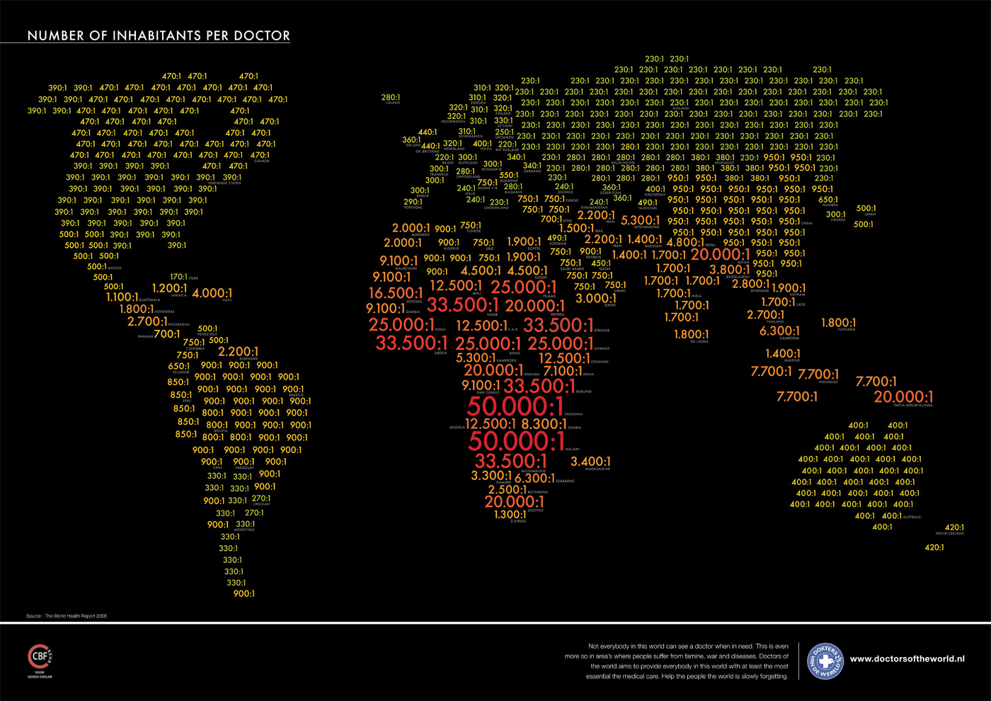 Мировая карта медицины в социалке для организации Doctors of the WorldЭтот постер, созданный нидерландским рекламным агентством EuroRSCG для общественной организации "Врачи Мира" (Doctors of the World), размещался в приемных врачей, чтобы проиллюстрировать количество врачей, приходящихся на одного человека по всему миру. Таким образом, посетителям старались показать бедственную ситуацию в некоторых регионах мира, нуждающихся в помощи.Надпись: "Количество граждан на одного доктора" Агентство: EuroRSCG Амстердам, Нидерланды Творческий директор: Laurens Boschman, Joost van Praag Sigaar Главный творческий директор: Lorenzo de Rita Арт директор: Laurens Boschman Копирайтер: Joost van Praag Sigaar Аккаунт-менеджер: Willem Nas, Eefje Beekmans |