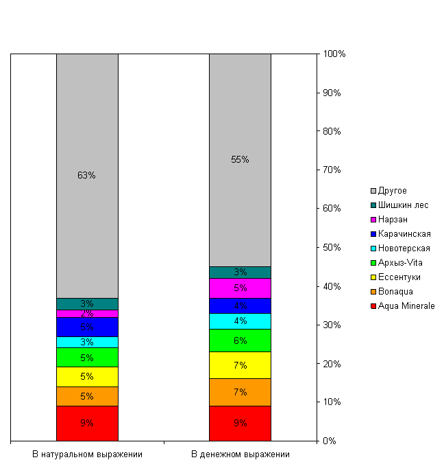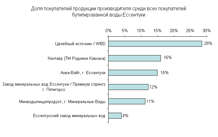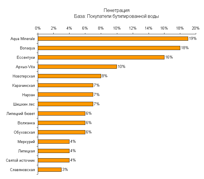 Любители Ессентуков выбирают Вимм-Билль-ДаннРомир представляет результаты исследования рынка бутилированной воды, полученные от трех тысяч домохозяйств (около 8100 панелистов) из 23 крупных городов России с населением 500 тысяч человек и более. Основной метод сбора информации – сканирование штрих-кодов покупок в online режиме. ![]() В тройку самых популярных брендов бутилированной воды входят Aqua Minerale (19%), Bonaqua (18%) и минеральная вода Ессентуки (16%). Архыз-Vita (10%), Новотерская (8%), Карачинская (7%), Нарзан (7%) и Шишкин лес (7%) можно отнести ко второй группе марок. На третьей позиции по популярности разместились: Липецкий бювет (6%), Волжанка (6%) и Обуховская. ![]() Наибольший объем покупок в указанный период приходится на Aqua Minerale (9%). Марки, доля которых в натуральном выражении составляет 5% - это Bonaqua, Ессентуки, Архыз-Vita и вода Карачинская. По 3% набралось у Новотерской и Шишкиного леса. Наименьшую долю занимает вода Нарзан (2%). ![]() Уникальный инструмент SSP предоставляет возможность не только оценить объемы потребления в целом, но и выявить предпочтения покупателей в отношении производителей. Так, во втором квартале 2007 года специалистами Ромир были зафиксированы покупки бутилированной воды Ессентуки 16-ти заводов изготовителей. Наибольшая доля покупок пришлась на продукцию компании «Целебный источник/Wimm Bill Dann» (29%). За ним следует предприятие «Кентавр» (16%). 15% - доля покупок воды, производимой «Аква-Вайт». Реже всего любители Ессентуков выбирают воду «Ессентукского завода минеральных вод» (4%). www.rmh.ru |