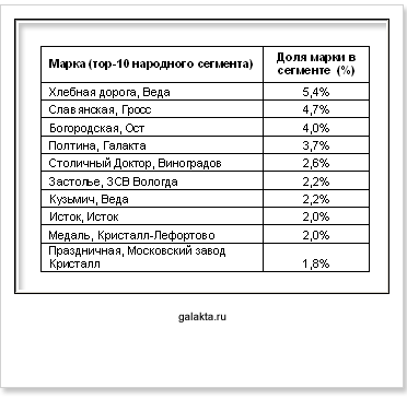 Аналитическая служба ГК «Галакта» составила рейтинг водочных брендов народного сегмента по итогам аудита розничной торговли ИА «Бизнес-аналитика», проведенного в мае-июне 2007 года в российских городах с населением свыше 100 тысяч человек.