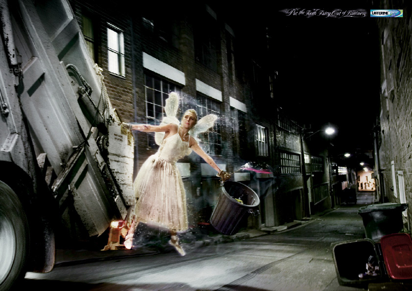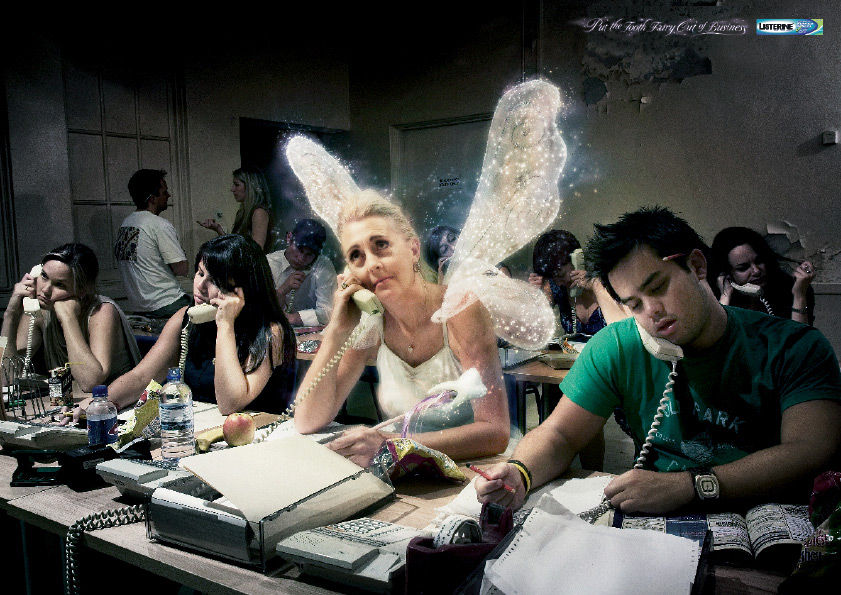 Зубная Фея пострадала из-за пасты ListerineПо мнению австралийского агентства JWT, зубная паста Listerine настолько хороша, что может уничтожить Зубную Фею, потому что для нее уже не будет работы и ей придется добывать себе питание, сидя на телефонной линии, убирая мусор или занимаясь грабежом.Надпись: "Оставьте Зубную Фею не при делах" Агентство: JWT, Австралия Писатель: Jay Benjamin & Andy Dilallo Арт директор: Andy Dilallo, Jay Benjamin Главный творческий директор: Jay Benjamin & Andy Dilallo Типограф: Jeffrey Oley, Myles Allpress Фотограф: Gary Sheppard Ретушер: Electric Art |