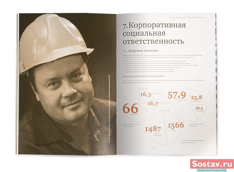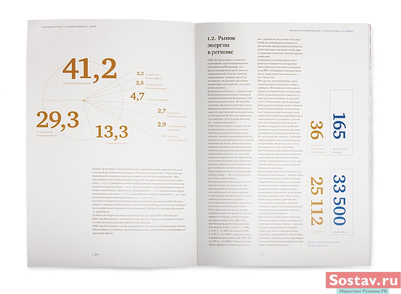 Годовой отчет для ОАО "Кузбассэнерго"По заказу компании "Кузбасcэнерго" Imadesign разработала концепцию годового отчета за 2006 год.Концепция оформления годового отчета основана на таких важных характеристиках компании, как открытость, надежность и масштабность. Дизайн отчета строится на использовании графических приемов, позволяющих передать главную мысль концепции "от частного к общему". Дизайн предусматривает активное использование портретной съемки, что призвано показать открытость компании и ее публичность. Изображения первых лиц имеют тот же размер, что и фото простых рабочих, что позволяет отразить демократичный и человечный подход руководства к управлению коллективом. На поддержание принципа "от общего к частному" работает и такой прием, как сочетание натурной съемки производственных объектов с макросъемкой отдельных деталей оборудования. Он позволяет отразить масштабность производства и продемонстрировать, что для компании нет мелочей: забота о малом - залог стабильной работы большого. Еще одним основным элементом дизайна стал фирменный оранжевый цвет, который является акцентным при отображении цифровой и графической информации, а также присутствует в фотоизображениях, придавая им эффект сепии. За счет "золотистого" оттенка сепия позволяет сделать фотографии более традиционными, напоминающими семейные черно-белые снимки, и в то же время - более живыми и эмоциональными. Особый акцент сделан на цифры, диаграммы и графики, которые намеренно созданы крупными, яркими и заметными, чтобы легче ориентироваться в информации отчета. В графиках и диаграммах активными элементами выступили не столько линии, столбцы и сектора, сколько крупные цифры, демонстрирующие приводимые в отчете данные. Расположение чисел (сверху вниз), использованное в графиках, более характерно для США и Великобритании, чем для континентальной Европы и России. Однако у него есть неоспоримое преимущество: это позволяет выстраивать данные так, чтобы повысить их наглядность, т.к. единицы располагаются под единицами, десятки - под десятками, сотни под сотнями, так что становится ясно видна динамика различных показателей. Это также работает на реализацию принципа "от общего к частному" и позволяет продемонстрировать весь масштаб деятельности компании. Для оформления текстового материала использовалась шрифтовая гарнитура Charter, которая гармонично сочетает в себе черты классических и инновационных шрифтов, в основе верстки лежит трехколонная сетка. Годовой отчет напечатан на плотной бумаге с оттенком слоновой кости в три краски: 2 фирменных пантона (оранжевый и синий) + черный, обложка - на крашенной в массе бумаге оранжевого цвета. Надпись "Годовой отчет Кузбассэнерго 2006" сделана по технологии конгрева. Состав творческой группы Креативный директор: Эркен Кагаров Арт-директор: Владимир Трушкин Дизайнеры: Сергей Первушин, Владимир Трушкин Препресс: Алексей Севериненко Технический директор: Александр Браницкий Менеджер проекта: Елена Борисенко Заказчик: ОАО "Кузбассэнерго" Менеджер проекта: Оксана Шпылько - начальник отдела корпоративных финансов и экономики |