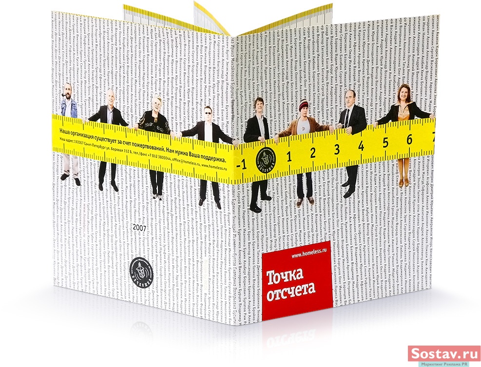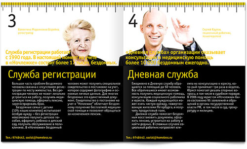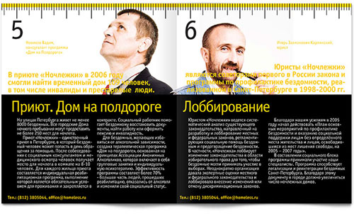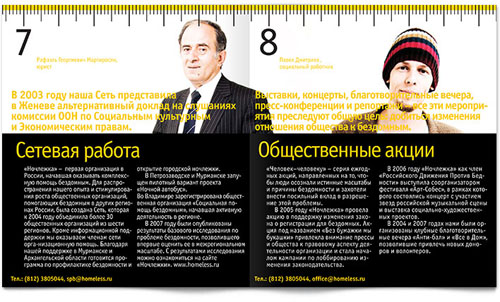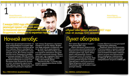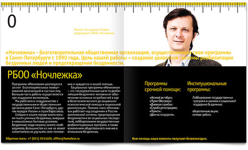 DEZA помогает жителям "Ночлежки"Студия DEZA разработала информационный буклет "Точка отсчета" для РБОО "Ночлежка".Лейтмотивом буклета стала желтая линейка, символизирующая кусок жизни человека попавшего в беду, и путь, который "Ночлежка" помогает пройти каждому, кто обратился за помощью. Социальная организация "Ночлежка" более семнадцати лет помогает бездомным Петербурга. Большинство клиентов "Ночлежки" - люди, оказавшиеся ниже той планки, которая в нашем обществе считается нормой. "Точка отсчета" - момент обращения в "Ночлежку" для тех, чья жизнь достаточно быстро катится по наклонной, означает возвращение в "состояние нуля". Они уже не ниже, но еще и не выше той отметки, которая дает им возможность двигаться вперед. И именно "Ночлежка", помогает сделать им первые шаги обратно в "нормальную" жизнь. Все начинается на улицах города с проектов "Ночной автобус" и "Пункт обогрева". Так "Ночлежка" оказывает экстренную помощь нуждающимся и впервые рассказывает им о своем существовании. Те, кто затем пришел в "Ночлежку" на Боровой, делают следующий шаг - всем известно чего стоит регистрация в России, специальная служба помогает всем нуждающимся получить временную регистрацию. Итак, человек уже имеет самое необходимое: еду, кров над головой и признан членом общества. "Без бумажки ты никто, а с бумажкой - человек". Далее следуют медицинская и психологическая помощь в реабилитационных группах. И, наконец, человек может устраиваться на работу и двигаться дальше самостоятельно. Для инвалидов и престарелых людей существует проект "Приют", в котором находят временный дом до 100 человек ежегодно. Каждая странице буклета посвящена конкретному шагу и представлена конкретным человеком, ответственным за него. Ведь работа "Ночлежки" - это, прежде всего, работа людей с людьми. И работают тут хорошие, добрые люди. Люди, которые делают серьезное, очень важное дело и делают его профессионально. "Ночлежка", как любая благотворительная организация, существует за счет пожертвований. Буклет адресован компаниям и лицам, принимающим решение об оказании финансовой помощи. Его задача продемонстрировать, чем конкретно занимается эта организация и на какие конкретно цели ей требуется средства. И главное: то, что делают эти люди - не местечковый проект по сбору милостыни, а серьезная система реабилитации для тех, кто попал в беду. Система, которая реально помогает людям. На обложке буклета - фамилии бывших бездомных, малая доля из тех 17 000 человек, которым "Ночлежка" помогла за время своего существования. Состав творческой группы Арт-директор: Александр Суворов Дизайн: Александр Суворов Тексты: Зоя Соловьева Фотограф: Александр Артеменко