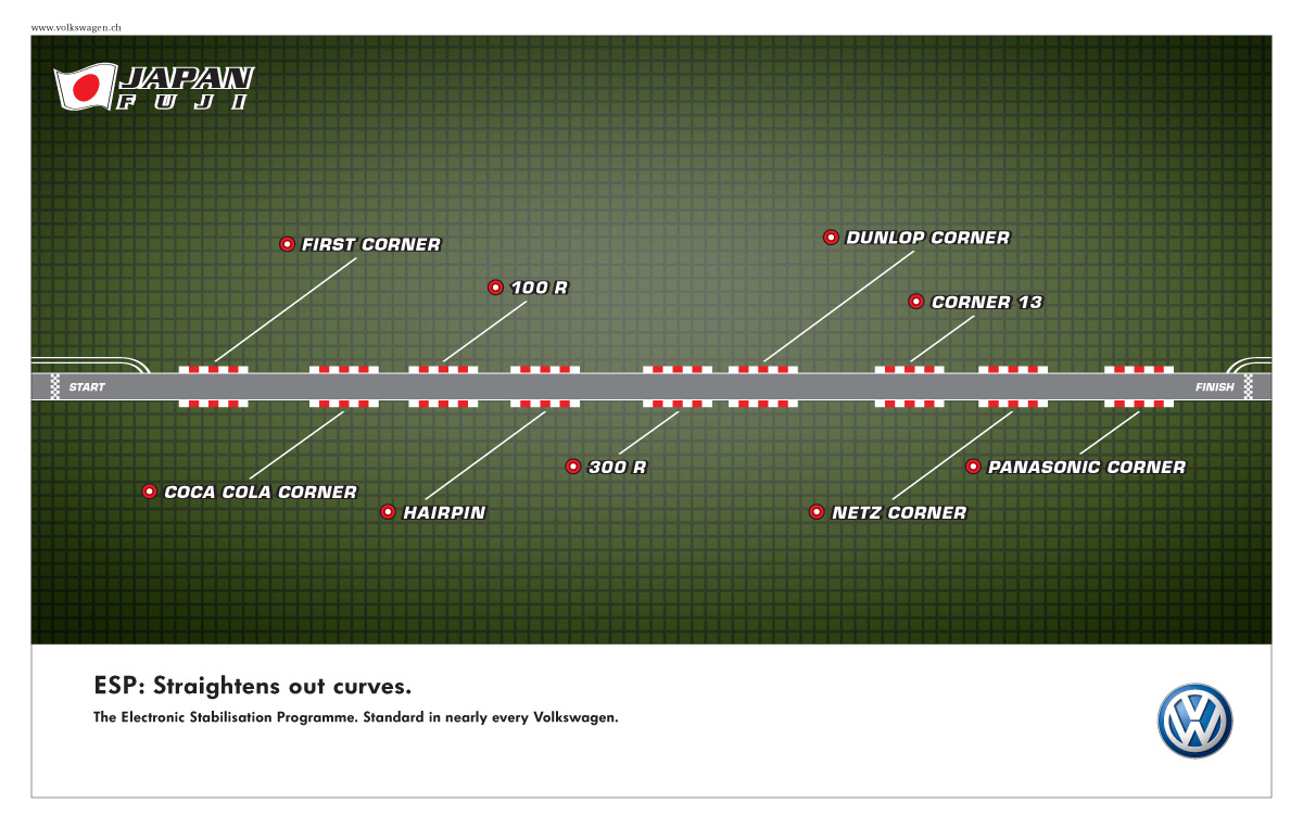 Volkswagen ESP выпрямляет трасы Formula-1Одна из новостей Formula-1 2007-ого года состояла в том, что Гран-при Японии пройдёт на обновлённой трассе Fuji. Именно эту трассу швейцарцы из агентства Krieg решили использовать, чтобы прорекламировать программу стабилизации Volkswagen ESP. На этом принте полная изгибов и поворотов трасса превратилась в совершенно прямую дорогу.Надпись: "ESP: Выпрямляет изгибы. Электронная Программа Стабилизации. В стандартной комплектации почти в каждом Volkswagen." Агентство: Krieg, Schlupp, B?rge / Springer & Jacoby, Цюрих, Швейцария Творческий директор: Daniel Krieg, Uwe Schlupp, Andreas M?dler Арт директор: Mario Moosbrugger Копирайтер: David Hugentobler |