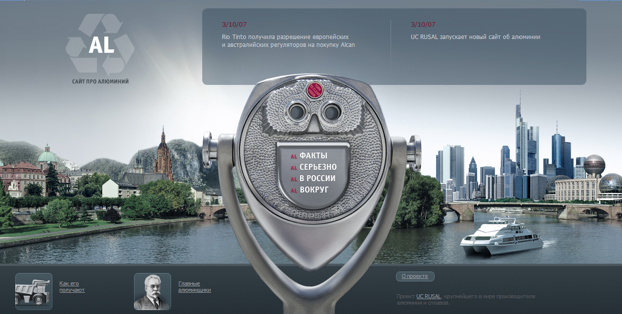 Он посвящен только алюминию и предназначен для широкого круга пользователей - школьников, студентов, журналистов, аналитиков, ученых и просто любознательных людей. На сайте регулярно публикуются свежие новости из мира алюминия. Как сообщила Sostav.ru директор по связям с общественностью компании UC RUSAL Вера Курочкина, сайт разработан коммуникационным холдингом BBDO Russia. |