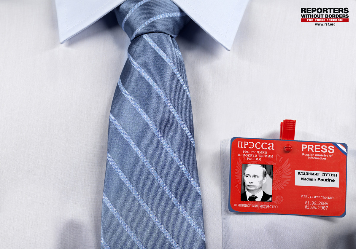 Saatchi & Saatchi Paris сделали из Владимира Путина врага свободы слова. Правда, с ошибкамиРепортеры без границ - интернациональная негосударственная организация по защите прав человека, охраняющая свободу слова во всем мире. По мнению этой организации и агентства Saatchi & Saatchi Paris, в таких странах, как Венесуэла, Тунис, Китай и Россия, власть диктует журналистам, что и как писать. Именно поэтому в роли репортеров на принтах выступают такие политические деятели, как президент Венесуэлы Уго Чавес, президент России Владимир Путин, второй президент Туниса Зин эль-Абидин Бен Али, председатель Центрального военного совета Китая Ху Цзиньтао.Ошибки, допущенные не только на принте про Россию, судя по всему, совершены намеренно. Агентство: Saatchi & Saatchi, Париж, Франция Творческий директор: Christophe Coffre Арт директор: Olivier Gamblin, Arnaud Van den Abeele Копирайтер: Olivier Gamblin Художественное оформление: Marion Venot Фотограф: Yann Forhan |