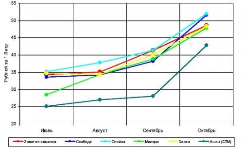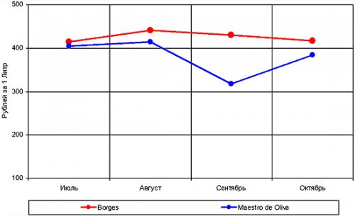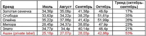 Ромир демонстрирует движение цен на растительное маслоАнализ проведен на основе данных, полученных от трех тысяч домохозяйств (около 8100 панелистов) из 23 крупных городов России с населением 500 тысяч человек и более. Основной метод сбора информации – сканирование штрих-кодов покупок в online режиме. СРЕДНЯЯ ЦЕНА ЗА ЛИТР ПОДСОЛНЕЧНОГО МАСЛА ![]() Динамика стоимости подсолнечного масла отслеживается по пяти лидирующим в объемах покупок отечественным брендам. Анализ показывает, что в последние две недели в России наблюдается значительный рост цен на масло. Так, если в сентябре литр Слободы стоил 38 рублей, то в первые две недели октября цена на продукт приблизилась к 52 рублям за литр. Аналогичная картина сложилась с Милорой: в сентябре – около 39 рублей за литр, в октябре – 48 рублей за литр продукта. ![]() Данная тенденция характерна и для частных марок. Подсолнечное масло, выпускаемое под брендом сети гипермаркетов «Ашан» значительно подорожало в указанный период (в сентябре – 28 рублей за литр, в первой половине октября – около 43 рублей). Ясно, что в абсолютном выражении private labels по стоимости все же отстают от федеральных брендов. СРЕДНЯЯ ЦЕНА ЗА ЛИТР ОЛИВКОВОГО МАСЛА ![]() Общая тенденция роста цен на продукты питания похоже не характерна для импортных товаров. Это видно из движения стоимости дорогих марок оливкового масла, ввозимых в Россию из зарубежья. Цена одного литра Borges, произведенного в Каталонии, в июле в среднем составляла 415 рублей, в августе выросла до 441 рублей, в сентябре снизилась до 430 рублей, а в первой половине октября упала до 416 рублей. Сходная ситуация и с другой испанской маркой Maestro de Oliva. Если в июле текущего года цена за один литр данного продукта на российском рынке соответствовала 404 рублям, то в октябре она снизилась до 384 рублей за литр. www.rmh.ru |