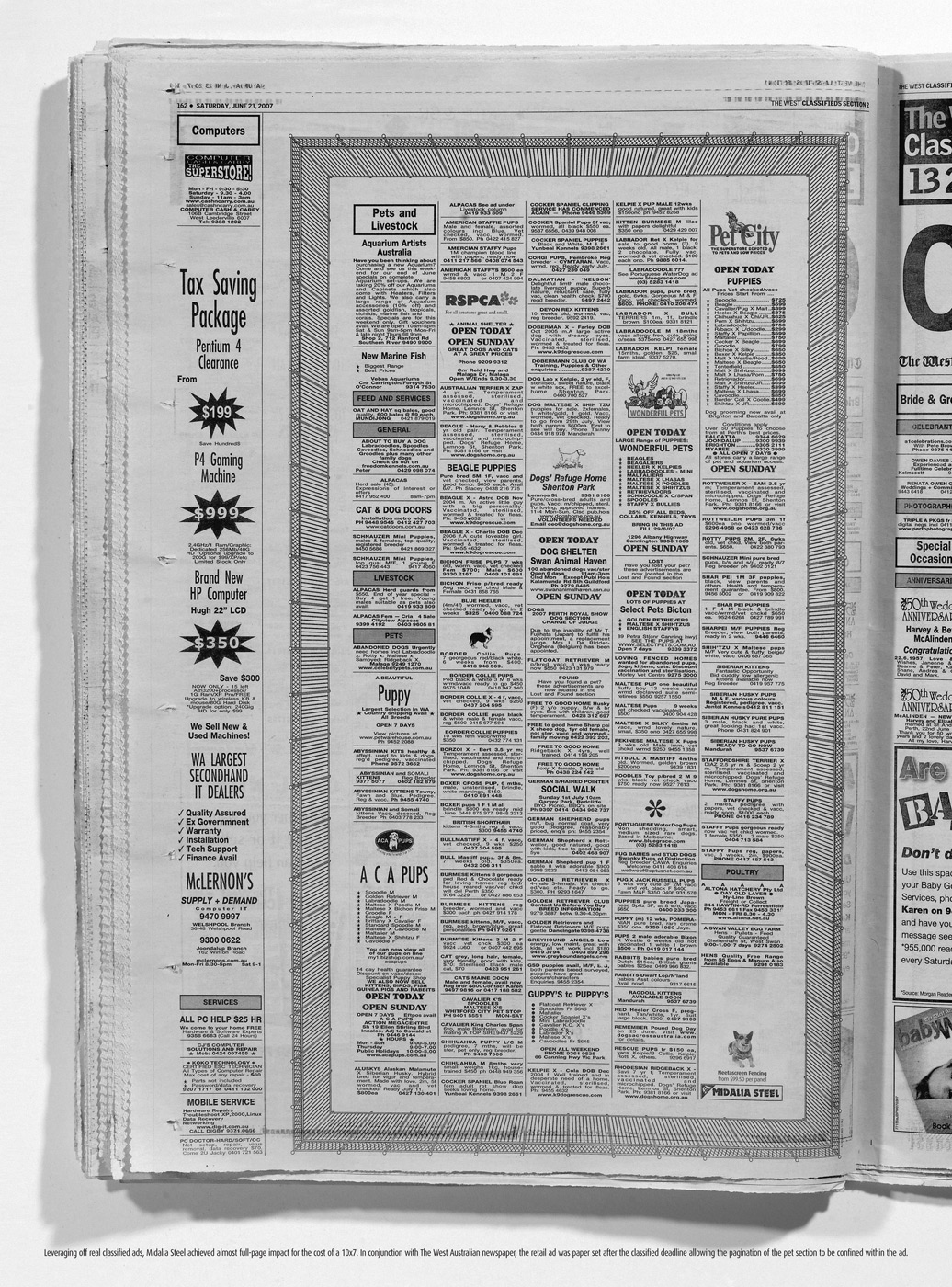 Midalia Steel: За решётку!В Midalia Steel решили использовать рубрику объявлений в газете The West Australian более рационально и обнесли забором объявления, посвященные домашним питомцам. Таким образом, Midalia Steel получили рекламу почти на всю страницу за стоимость объявления 10x7.Состав творческой группы Рекламное агентство: Ad Impact, Australia Арт директор/копирайтер: Drew Ridley, Steve Lorimer Медиа меденжер: Larissa Butler |