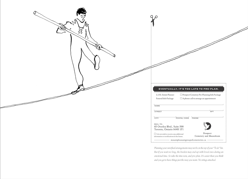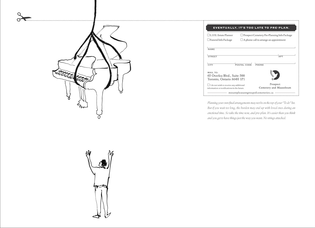 Рекламная кампания похоронной конторы Mount Pleasant от агентства ACLCВсе мы когда-нибудь умрем, но когда это будет, знает один Господь Бог, поэтому свою смерть нужно планировать заранее, считает канадское агентство ACLC, разработавшее эти буклеты для кладбища и похоронной конторы Mount Pleasant. Чтобы заполнить анкету, напечатанную на этих буклетах, необходимо вырезать ее, но тогда случится непоправимое…Надпись: "В конечном счете, слишком поздно, чтобы планировать. Планирование ваших финальных действий, возможно, не наверху вашего списка дел. Но если вы будете ждать слишком долго, это бремя может лечь на плечи ваших любимых в момент их переживаний. Так что не торопитесь сейчас и запланируйте. Это проще, чем вы думаете, и вы устроите все так, как захотите. Без каких бы то ни было условий." Агентство: ACLC, Торонто, Канада Творческий директор: Tony Miller Копирайтер: Jason Locey Арт директор: Rodger Eyre Иллюстратор: John Coburn |