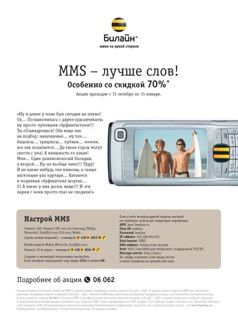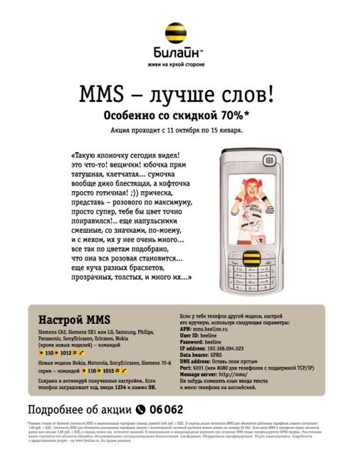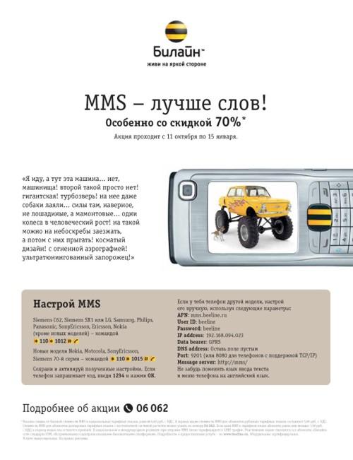 Лучше сто раз увидеть, чем один раз прочитать15 октября стартует кампания MMS price offer - 70% скидка на MMS. Носредственно рекламный ролик, один из планируемых двух, появится в эфире 17 октября. Рекламные носители, задействованные в кампании: радио, пресса, интернет, метро, indoorСостав творческой группы BBDO Moscow: Эккаунт-менеджер: Анастасия Букина, Кирилл Солод Эккаунт-директор: Лиз Адомако Арт Директор: Артем Альтман, Валентина Наумова, Денис Шмалько Копирайтер: Екатерина Суворова, Михаил Котов Руководитель креативной группы: Юлия Довлатова, Николай Пынти Креативный директор: Андрей Ильясов Продюсер агентства: Анастасия Коновалова Продакшн хаус: Filmservice Режиссер: Ragnar Jansson Оператор: Jacob Kusk Пост продакшн: Трехмер Продюсер: Kamila Balvinova