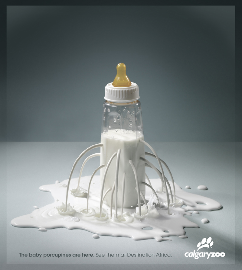 Calgary Zoo: дикобразов молоком не поить!Этот рекламный принт создан канадским агентством Trigger для зоопарка в городе Калгари Calgary Zoo. Дело в том, что детенышу дикобраза предложили бутылочку молока, но это оказалось плохой идеей. А если вы хотите посмотреть на колючего малыша вживую, то вас приглашают посетить тот зоопарк.Надпись: "Детеныши дикобразов здесь. Посмотри на них в Африканской Зоне." Агентство: Trigger, Калгари, Канада Творческий директор: Patrick Doyle Арт директор: Joel Arbez Копирайтер: David Delibato Фотограф: Jean Perron |