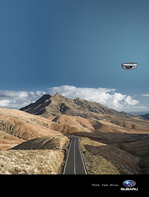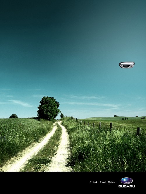 Subaru открывает дверь в свободуНе пугайтесь, это не НЛО, это ручка от автомобильной двери. Таким необычным способом колумбийское агентство ADE пытается донести до ЦА то, что обладание автомобилем Subaru открывает для нас новые горизонты, свободное перемещение и т.д. и т.п.Надпись: "Думай. Ощущая. Управляй." Агентство: ADE, Богота, Колумбия Творческий директор: Nacho Martinez Арт директор: Cristian Borrero Копирайтер: Andres Canas Другое: Tomas Casallas, Sebastian Daza |