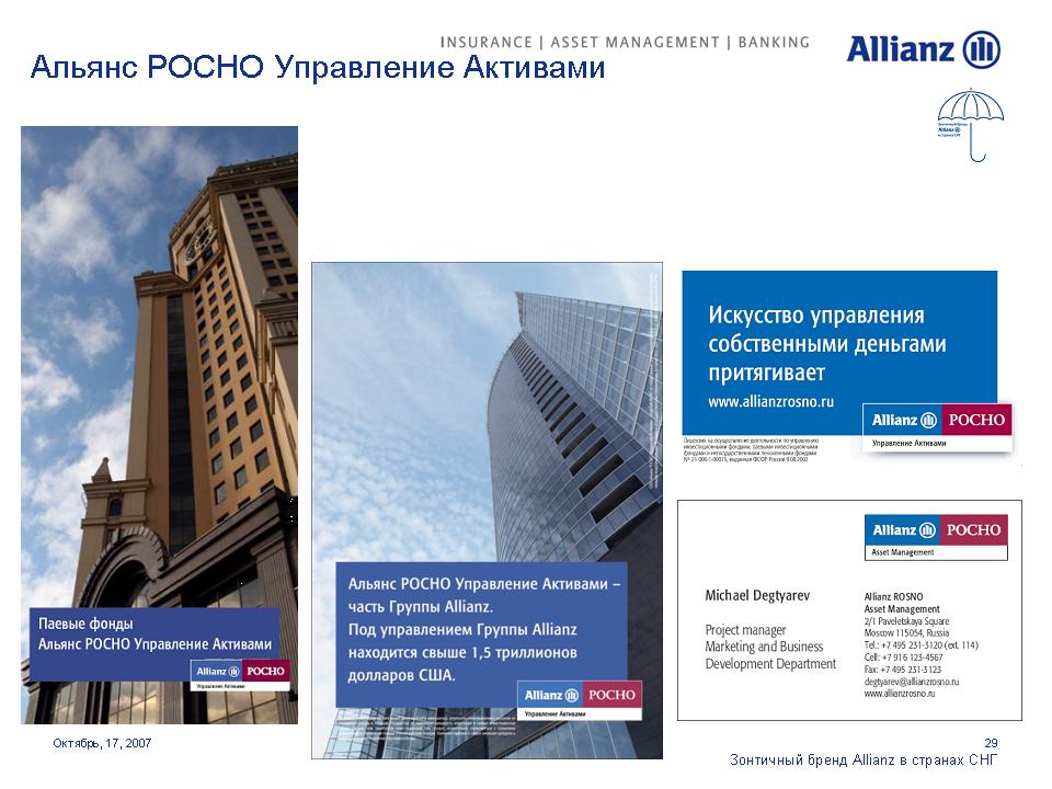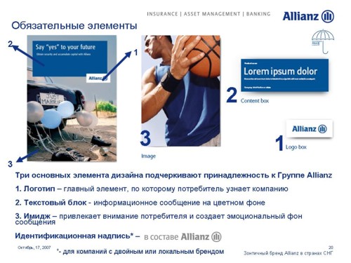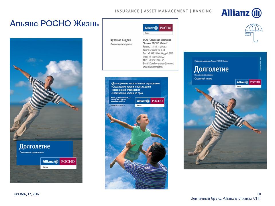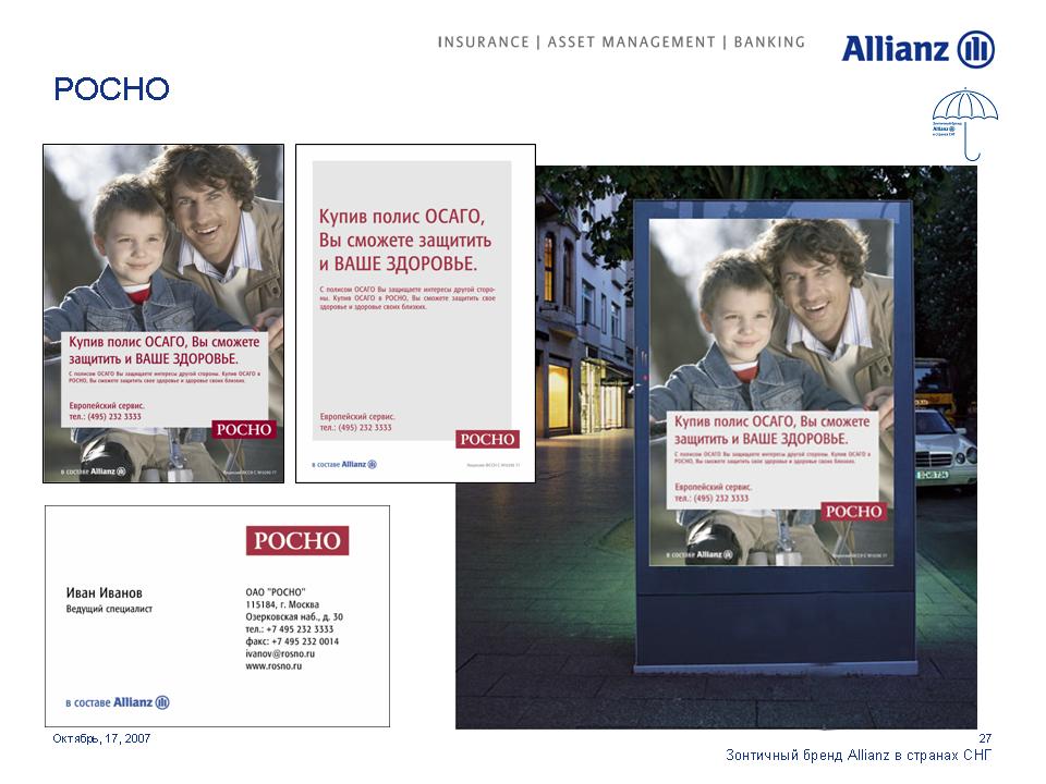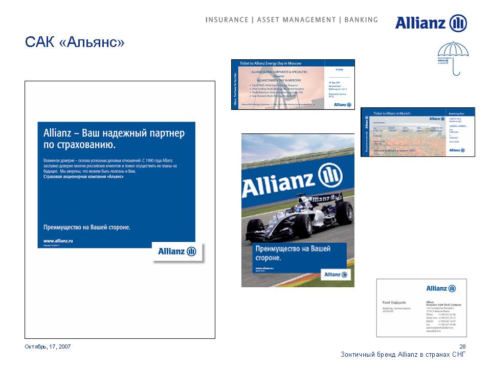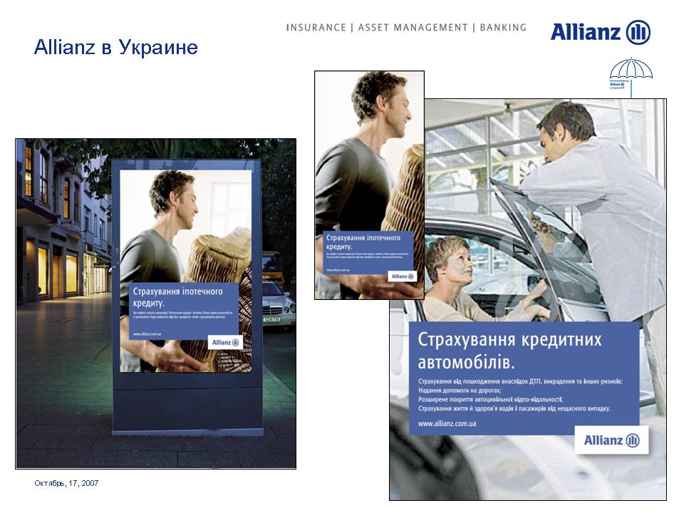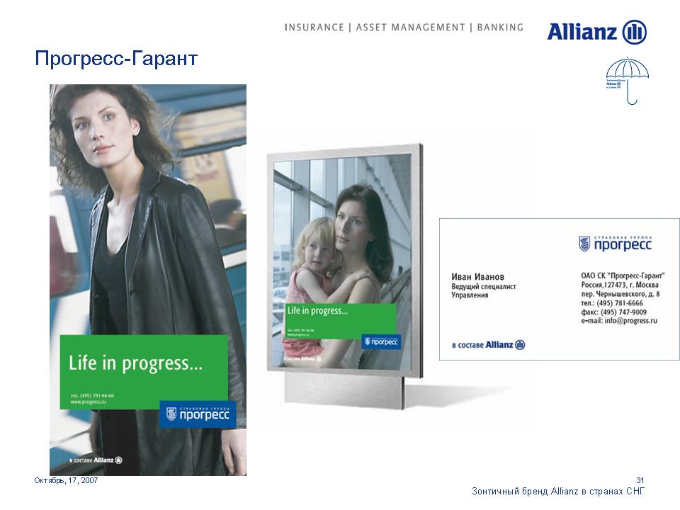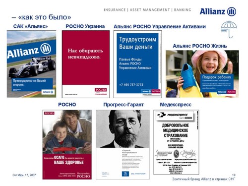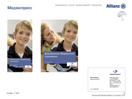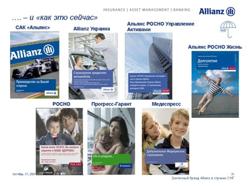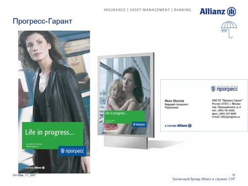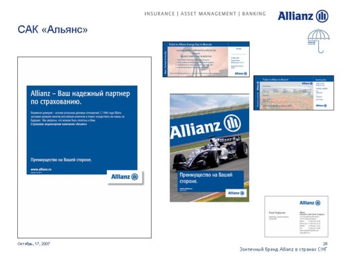 Под зонтом Allianz. Страховая компания стремится увеличить свое влияние на просторах СНГОдин из мировых лидеров в сфере страховых и финансовых услуг Группа Allianz выделяет Россию как ключевой рынок для своего роста. Руководство Группы намерено инвестировать в нашу страну дополнительные средства для укрепления своих брендов. 17 октября на встрече с журналистами Allianz представила обновленные бренды своих дочерних и аффилированных компаний в России, Украине и Казахстане. Стратегия развития компаний будет построена на основе зонтичного бренда Allianz с сохранением большинства из них своих названий.Единый корпоративный стиль, одинаковые элементы в оформлении рекламных и информационных материалов и единые принципы их расположения будут характеризовать принадлежность всех брендов к Группе Allianz. Под общий стандарт приведены шрифты и иллюстративные материалы. Кроме того, для всех компаний, в наименовании которых не присутствует бренд Allianz, стала обязательной дополнительная идентификационная надпись "в составе Allianz", которая будет размещаться в нижнем левом углу всех рекламных модулей. По словам первого вице-президента Allianz SE по маркетингу Мартина Маргануса, единые принципы корпоративного дизайна позволят достичь эффекта синергии, усиливающего как Группу в целом, так и отдельные бренды. Г-н Марганус отметил, что в каждой стране компании имели возможность выбора для себя подходящих рекламных материалов. Каждый бренд имел возможность использовать 15 различных сюжетов видеороликов и 20 различных печатных и онлайн модулей для адаптации к особенностям местных рынков.