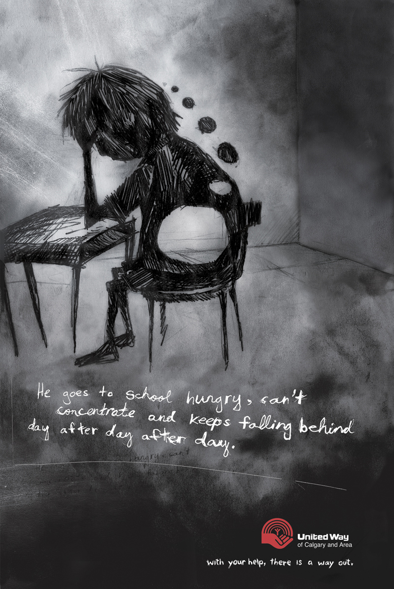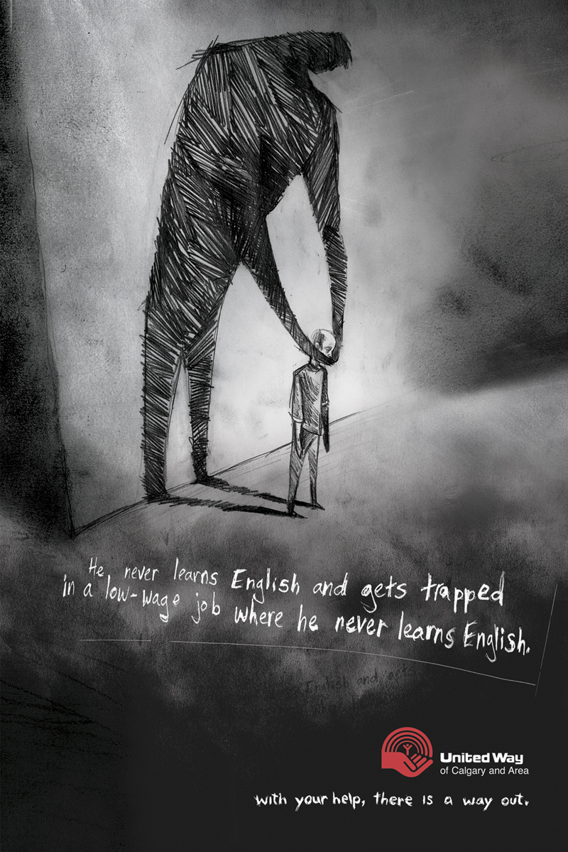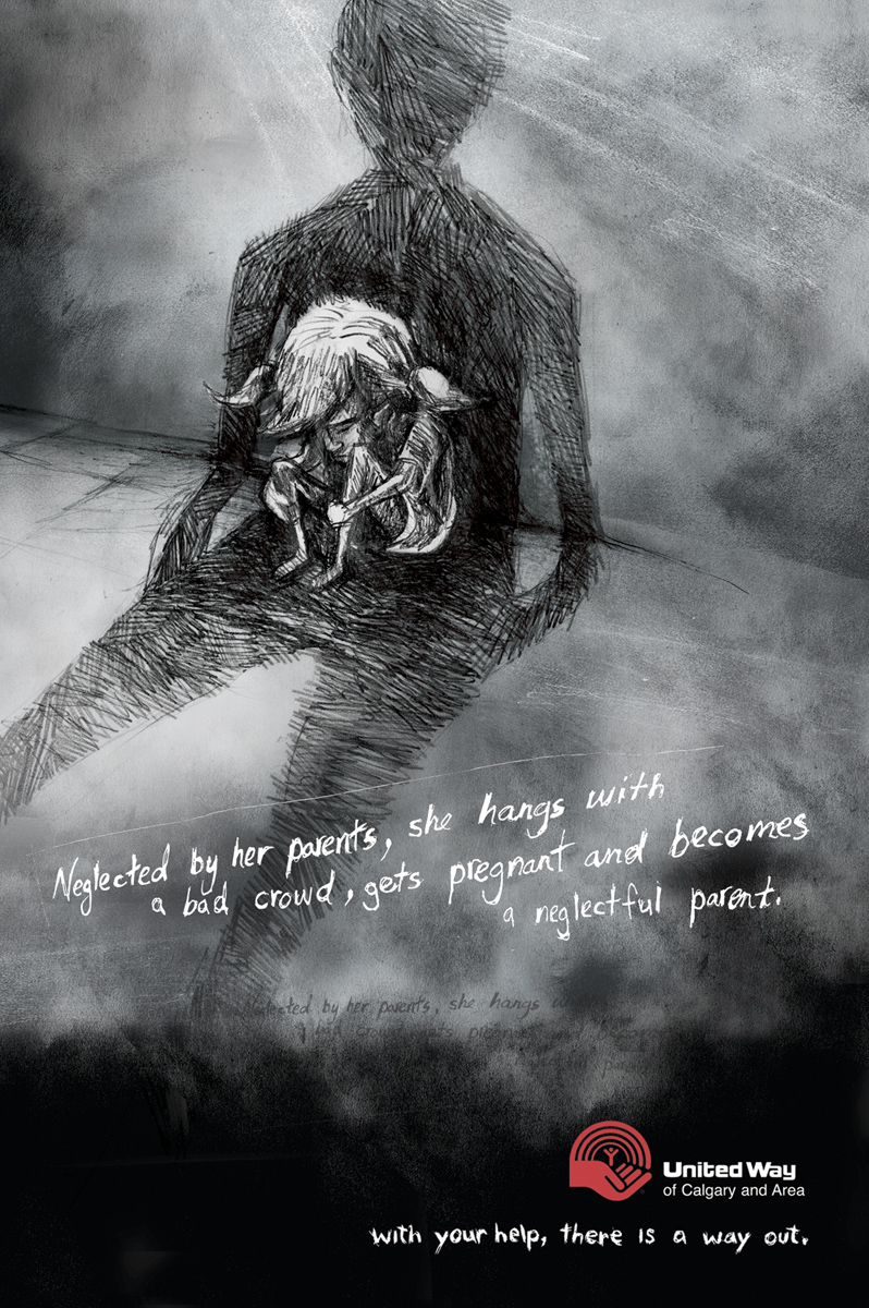 Замкнутый круг. Социалка United Way of Calgary and AreaНуждающимся и несчастным людям сложно самим выбраться из ситуации, в которую они попали. Именно поэтому канадское агентство Trigger с помощью этой социалки призывает нас изменить ход вещей и помочь нуждающимся.Надпись: "Ее родители не обращают на нее внимания, поэтому она попадет в плохую кампанию, забеременеет и сама станет небрежным родителем. Он ходит в школу голодный, не может сконцентрировать и продолжает скатываться день ото дня. Он никогда не учил английский язык и пойман в ловушку на низкооплачиваемой работе, где он никогда не выучит английский язык. Благодаря вашей помощи есть выход." Агентство: Trigger, Канада Творческий директор: Patrick Doyle Арт директор / Иллюстратор: Joel Arbez Копирайтер: David Delibato |