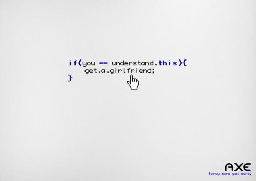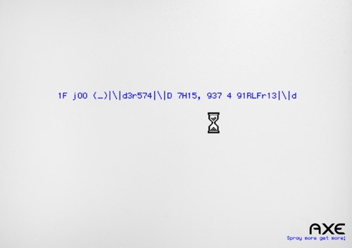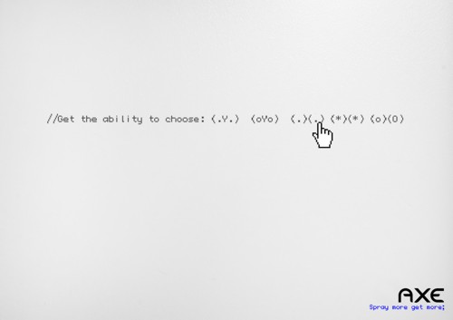Axe проводит тест на зависимость от компаЕсли вы слишком увлечены компьютерами, то это ненормально и вам срочно нужна девушка, считают студенты из школы рекламы Miami Ad School Europe, создавшие эти принты для Axe. С помощью надписей на этих плакатах вы можете протестировать себя: если вы понимаете то, что на них написано, то вам пора искать подружку. А поможет вам в этом конечно Axe.Надпись: "Если ты можешь прочесть это, то найди себе подружку. Получите возможность выбора: (.Y.) (oYo) (.)(.) (*)(*) (o)(0) Если ты понимаешь это, то найди себе подружку." Школа Рекламы: Miami Ad School Europe Арт директор: David Aronson, Thomas Kuhn ![]() |