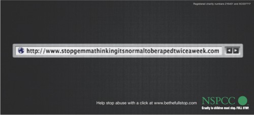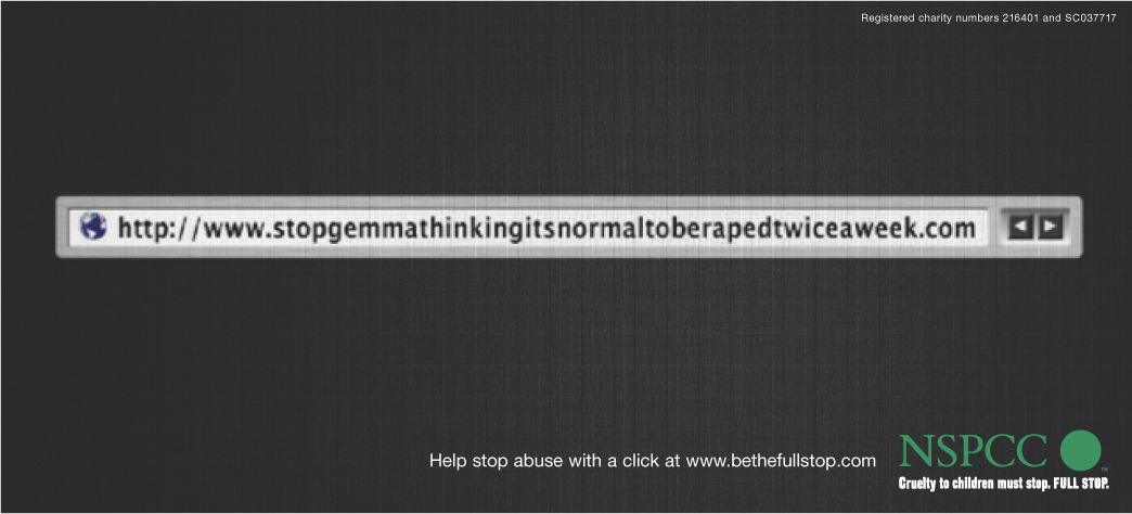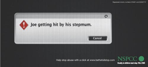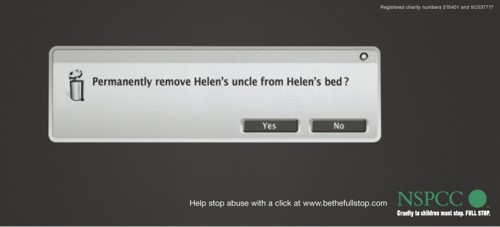 bethefullstop.com: кликни и начни помогатьНачать помогать детям, с которыми жестоко обращаются, можно, по мнению агентства Saatchi & Saatchi, просто зайдя на сайт bethefullstop.com. Это также легко, как отреагировать на сообщение вашего компьютера - нужно всего лишь кликнуть. Именно эту мысль призваны донести до нас эти принты.Надпись: "Заставьте Джему прекратить думать, что быть изнасилованной два раза в неделю - это нормально. Джо ударила его приемная мать. Отменить. Удалить дядю Элен из постели Элен? Да Нет Помогите остановить жестокое обращение, кликнув www.bethefullstop.com Жестокость к детям должна быть остановлена. Совсем остановлена" Агентство: Saatchi & Saatchi, Лондон, Соединенное Королевство Главный творческий директор: Kate Stanners Творческий директор: Paul Domenet, Brain Connolly Копирайтер / Арт директор: Eoghain Clarke, Julian Andrews Ретушь: irstbase |