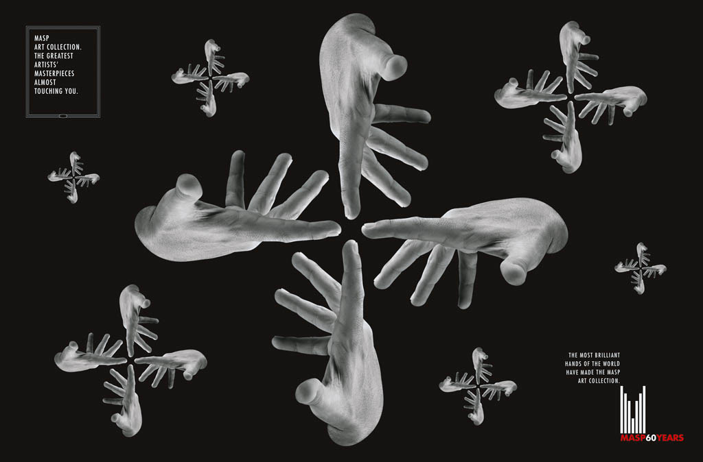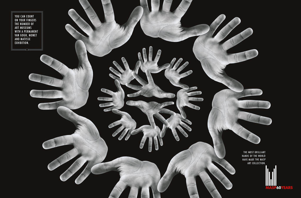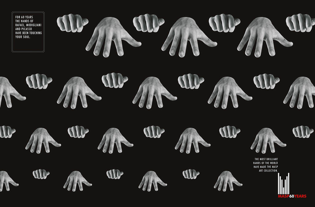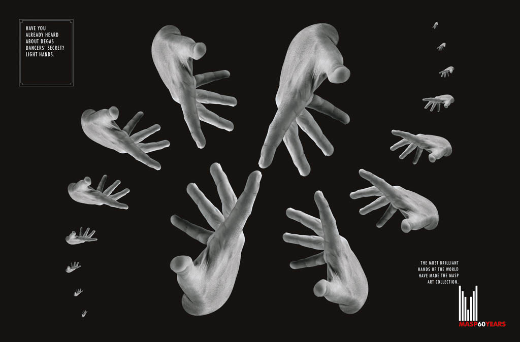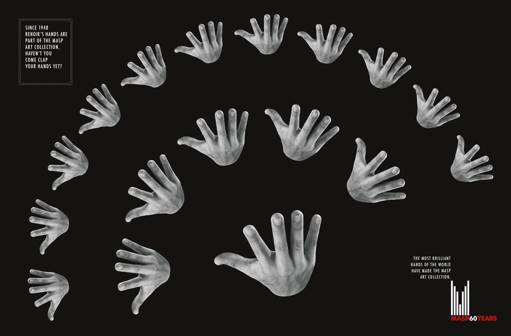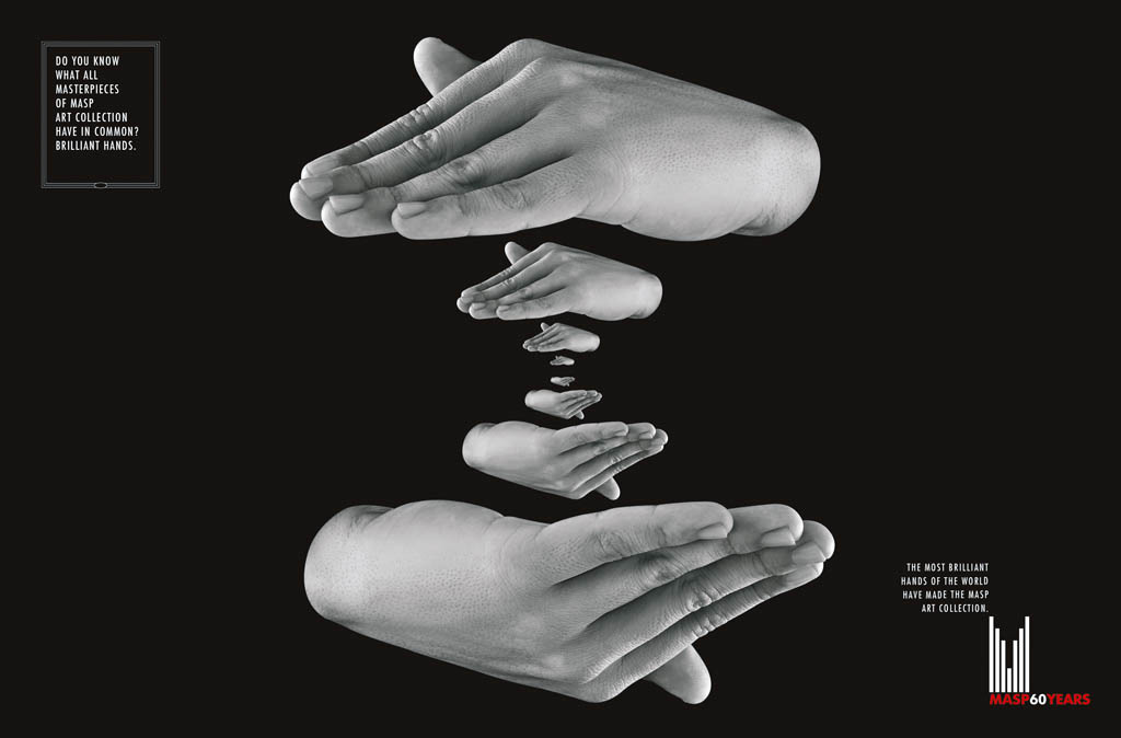 Много рукВ Музее Искусств Сан-Паулу (MASP) собраны произведения многих величайших художников. А какой главный инструмент любого художника? Конечно же, руки. Именно поэтому эта рекламная кампания, созданная бразильским агентством MPM Propaganda, акцентирует все внимание на руках.Надпись: "Коллекция произведений искусства MASP. Шедевры величайших художников практически прикасаются к вам. В течение 60 лет руки Гойи, Портинари и многих других художников массировали твой мозг. Вы уже услышали о тайне танцовщиц Дега? Легкие руки. В течение 60 лет руки Рафаэля, Модильяни и Пикассо прикасались к твоей душе. С 1948 рука Реноира - часть коллекции произведений искусства MASP. Вы еще не приходили поаплодировать? You can count on your fingers the number of art museums with a permanent Van Gogh, Monet and Matisse Exhibition. Вы можете пересчитать по пальцам число художественных музеев с постоянным выставками Ван Гога, Моне и Матисса. Do you know what all masterpieces of MASP art collection have in common? Brilliant hands. Знаете ли вы, что общего у всех шедевров коллекции произведений искусства MASP? Блестящие руки. Самые блестящие руки мира создали коллекцию произведений искусства MASP." Агентство: MPM Propaganda, Сан-Паулу, Бразилия Творческий директор: Aaron Sutton, Jorge Iervolino Арт директор: Guilherme Somensato Копирайтер: Jos? Arnaldo Suaid Фотограф: Leonardo Luz |