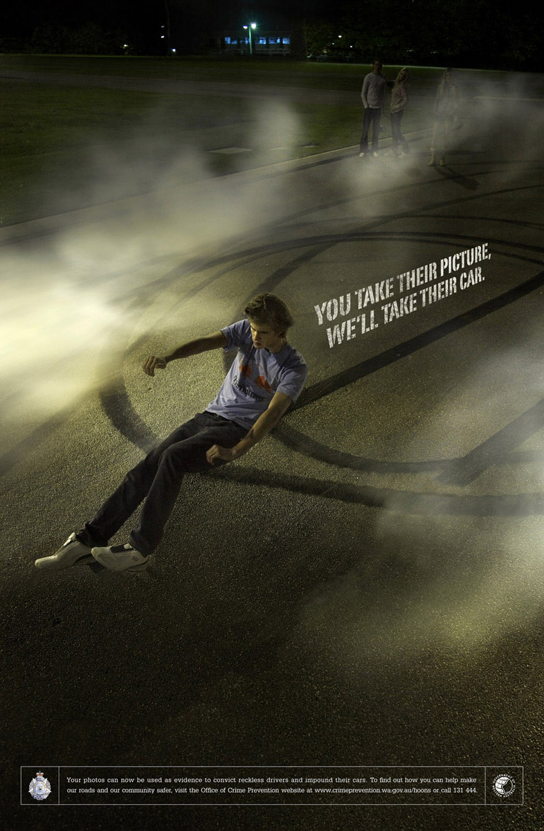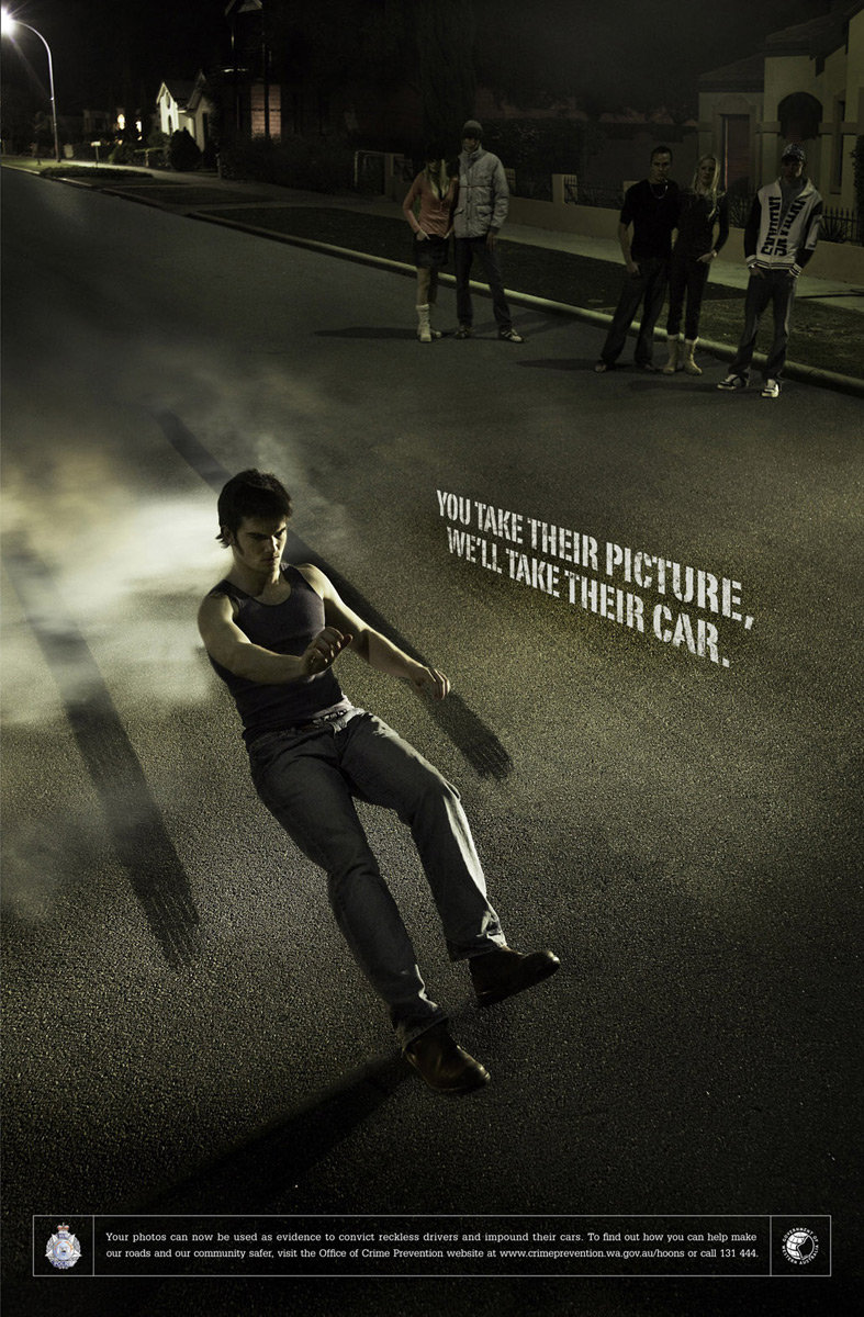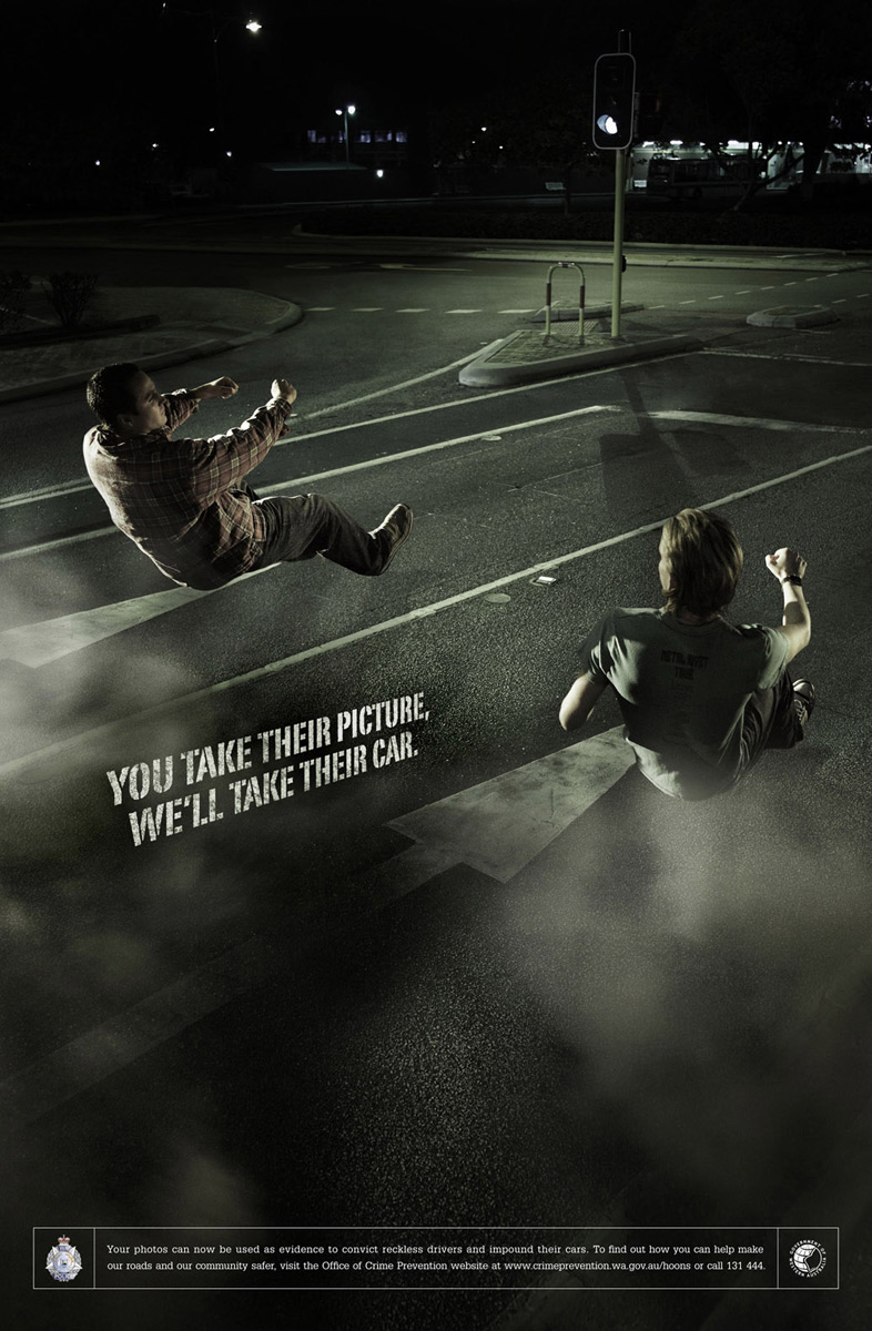 Агентство Marketforce убрало со щитов автомобили, чтобы показать силу вашей фотографииЕсли вас обидел на улице какой-нибудь водитель или вы заметили нарушение ПДД, то просто сфотографируйте нарушителя и пришлите это фото в Управление по Предотвращению Преступлений Австралии (Office of Crime Prevention), тогда нарушителю уже не избежать наказания вплоть до конфискации автомобиля. Именно это нам пытается сообщить австралийское агентство Marketforce с помощью этих принтов, с которых исчезло транспортное средство.Надпись: "Вы делаете их фотографию, мы забираем их машины. Ваши фотографии теперь могут использоваться как доказательство, чтобы вынести приговор опрометчивым водителям и конфисковать их автомобили. Чтобы узнавать, как Вы можете помочь делать наши дороги и общество более безопасными, посетите вебсайт Управления по Предотвращению Преступлений (Office of Crime Prevention) www.crimeprevention.wa.gov.au/hoons или позвоните 131 444." Агентство: Marketforce, Перт, Австралия |