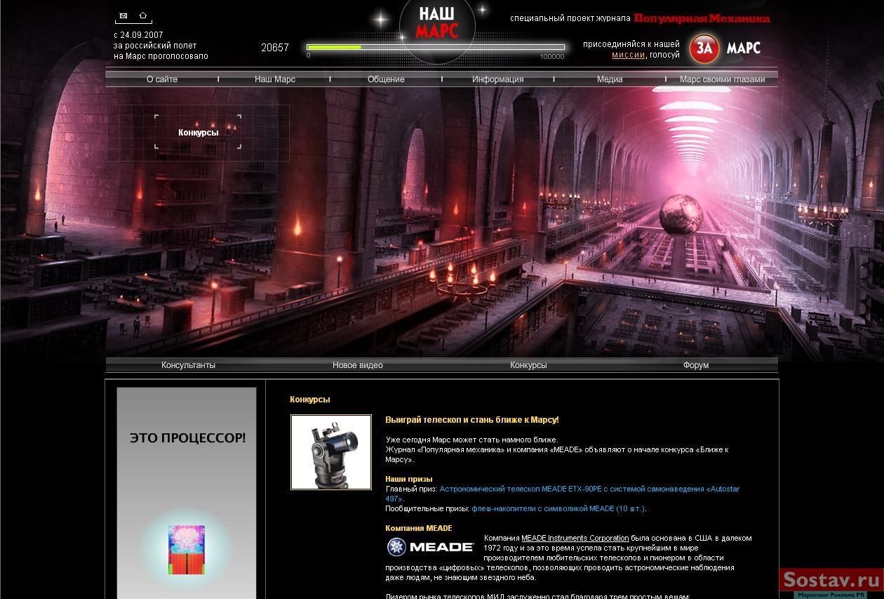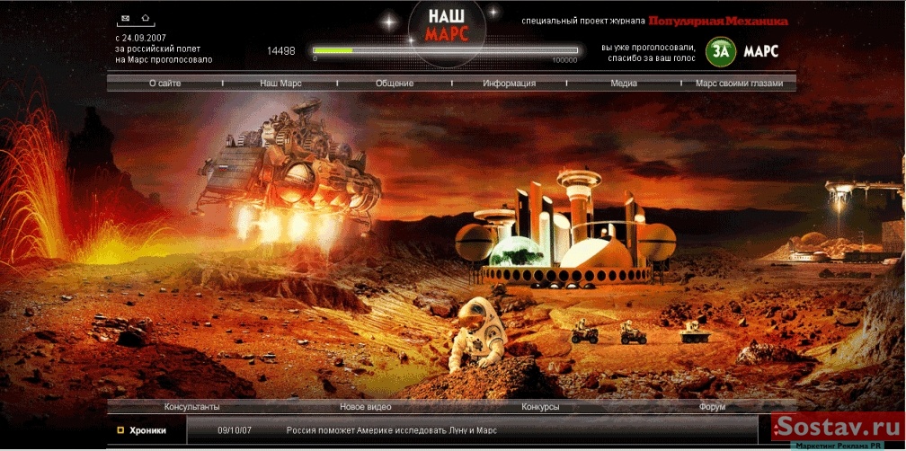 Русские на Марсе в спецпроекте журнала "Популярная механика" Команда журнала "Популярная механика" разработала онлайновый проект "Наш Марс". Проект представлен в виде интерактивного веб-ресурса, основная идея которого - привлечь внимание общественности к обсуждению вопроса: нужно ли России отправлять собственную пилотируемую экспедицию на Марс?Продвижением рекламной кампании в Интернете занимается агентство MediaStars. Журнал призывает зайти на сайт www.go2mars.ru и поучаствовать в голосовании всех, кого волнует статус России в области освоения космоса. Создатели полагают, что обсуждением данного вопроса должны заниматься не только чиновники и Администрация Президента. Результаты голосования будут донесены до органов власти через открытое письмо в СМИ. На сайте можно поучаствовать в конкурсах и побороться за главный приз - астрономический телескоп, а также тысячу других подарков из серии "Завтрак космонавта". В качестве каналов коммуникации задействованы сайты: vedomosti.ru, smartmoney.ru, lenta.ru , rb.ru и другие популярные ресурсы Рунета. "Многие считают, что для России освоение космоса, в частности Марса, - роскошь непозволительная. Мол, и других проблем хватает, а тут такие капитальные вложения. Я уверен, что пилотируемая экспедиция на Марс для России просто необходима. Я голосую - ЗА!" - заявил Леонид Алексеевич Горшков, руководитель работ по марсианской программе в РКК "Энергия". А вот мнение главного редактора журнала " Популярная механика", Александра Грека, голосующего также "ЗА": "Безусловно, важен вопрос, сколько всё это стоит и кто будет платить. По оценкам специалистов, затраты на проект составят около $20 млрд в течение десяти лет, то есть по $2 млрд. в год. Много это или мало? Например, каждая атомная лодка "Юрий Долгорукий" обходится России аккурат в миллиард. Так что россиянам выбирать, на что тратить деньги". В ходе дискуссии с участием ведущих специалистов читатели смогут не только взвесить все "за" и "против" снаряжения экспедиции на Марс, но и представить себе подробности полета и будущей колонизации планеты, обсудить технические проблемы и социальные последствия. Изучая сайт, можно почерпнуть подробную информацию об истории изучения Красной планеты, текущих и будущих проектах ее освоения. Кроме того, на сайте представлено уникальное видео - космические катастрофы, документальные фильмы о Марсе. |