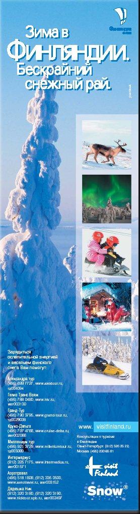 Как рассказала AdLife.spb.ru директор представительства Центра по развитию туризма Финляндии, это - часть кампании, проводимой совместно с 20 туроператорами, среди которых - 11 московских и 9 питерских турфирм. Началась акция в сентябре, когда рекламная информация появилась в специализированных журналах о туризме и отдыхе – таких, как Тraveller, Тour info и другие. «Реклама направлена на то, чтобы привлечь в Финляндию больше туристов, одновременно разрушив стереотип о том, что Финляндия – это только лыжные курорты. Хотелось бы, чтобы наши потенциальные гости знали, какое разнообразие видов отдыха их у нас ждет», - прокомментировала она.