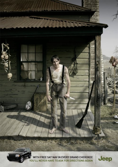 Принт в жанре фильма "Поворот не туда" от Jeep Sat NavВо многих фильмах ужасов можно видеть сцену, когда путники, свернув не на ту дорогу, сталкиваются с неприятностями с лице монстров, уродов и прочих тварей. Австралийское агентство Clemenger BBDO заверяет, что если вы обладаете автомобилем Grand Cherokee со спутниковой навигационной системой Sat Nav в базовой комплектации, то вы точно не свернете не туда.Надпись: "С бесплатной Sat Nav в каждом Grand Cherokee вам никогда больше не придется спрашивать дорогу. Jeep" Агентство: Clemenger BBDO, Мельбурн, Австралия Фотограф: Garry Moore Арт директор: Gus Johnston Продюсер: Andrea Le Suer Производство: Miss Bossy Boots, Мельбурн ![]() |