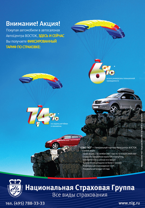 Над пропастью под парашютом. АвтоЦентр Восток рекламирует свою промоакцию"Национальная страховая группа" и АвтоЦентр Восток проводят совместную акцию. По ее условиям, всем клиентам, приобретающим автомобили марок Kia и SsangYoung в АвтоЦентре Восток, "Национальная страховая группа" предоставляет фиксированные тарифы по страховке (6% на все универсалы повышенной проходимости и 7,4% на седаны, хетчбеки и минивены).Для продвижения этой акции был создан рекламный макет. |