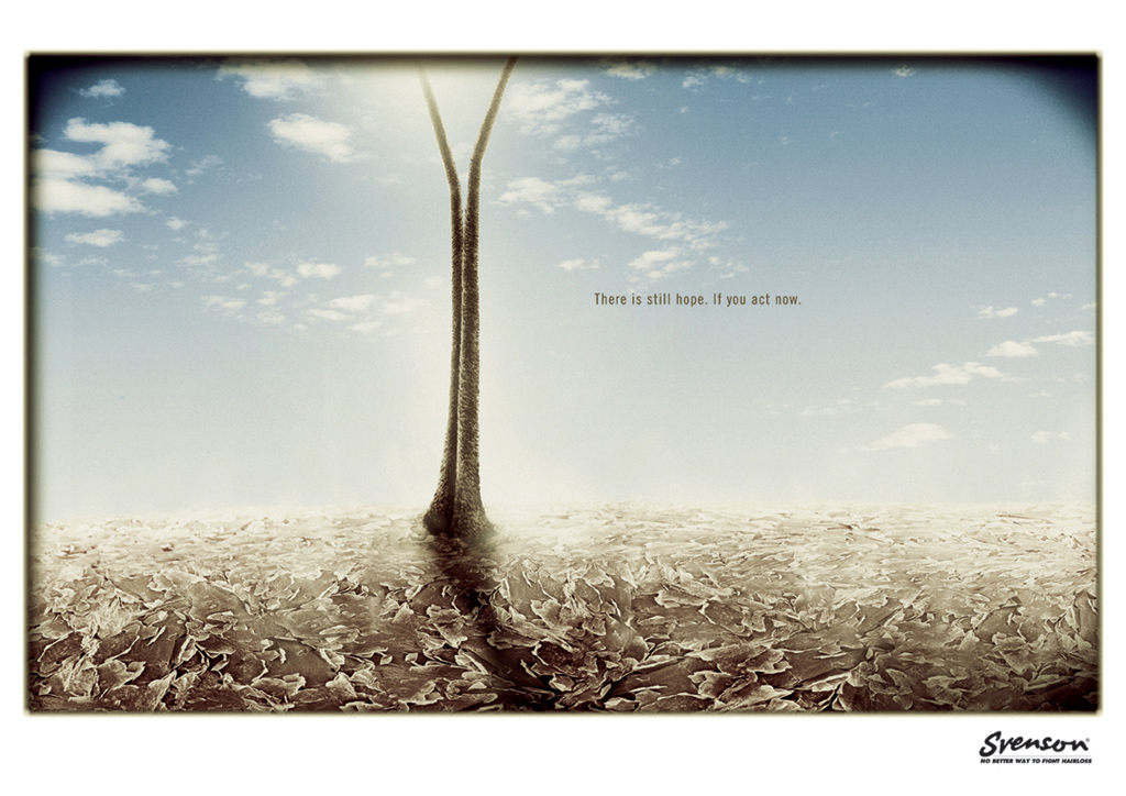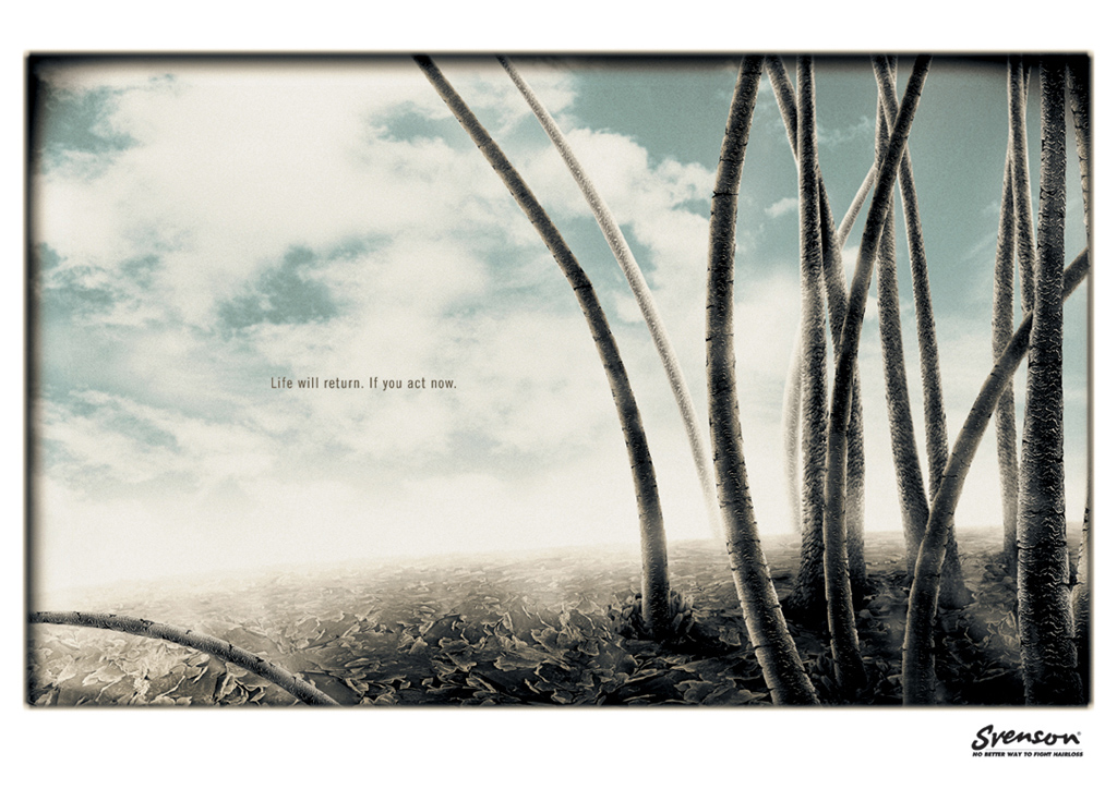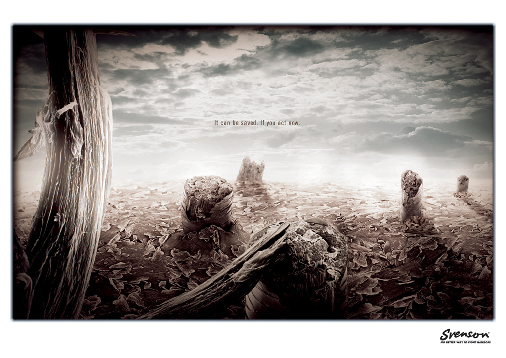 Необычные пейзажи в рекламе центра Svenson Hair CentreЭто отнюдь не пейзажи местности, которая когда-то была покрыта лесом, это увеличенные съемки кожи головы человека, который страдает от потери волос. Но надежда еще есть, считает агентство Publicis Singapore, просто нужно как можно быстрее обратиться в центр Svenson Hair Centre, который поможет вам справится с вашей проблемой.Надпись: "Жизнь может вернуться. Если действовать сейчас. Надежда все еще есть. Если действовать сейчас. Все еще может быть спасено. Если действовать сейчас. Нет лучшего пути для борьбы с потерей волос." Агентство: Publicis Singapore Региональный главный творческий директор: Calvin Soh Главный творческий директор: Sandip KT Арт директор: Chong Wei Lun, Koh Que Din Копирайтер: Ho Pei Ling Фотограф: Stock (Getty Images) Цифровая обработка: Christopher Ng (Procolor Imaging) Продюсер агентства: Stephenie Lee Менеджер по производству: Daniel Tay Аккаунт-менеджер: June Chu Другое: Aileen Chua, Celeste Cheong (ProColor), Joel Choo (Getty Images) |