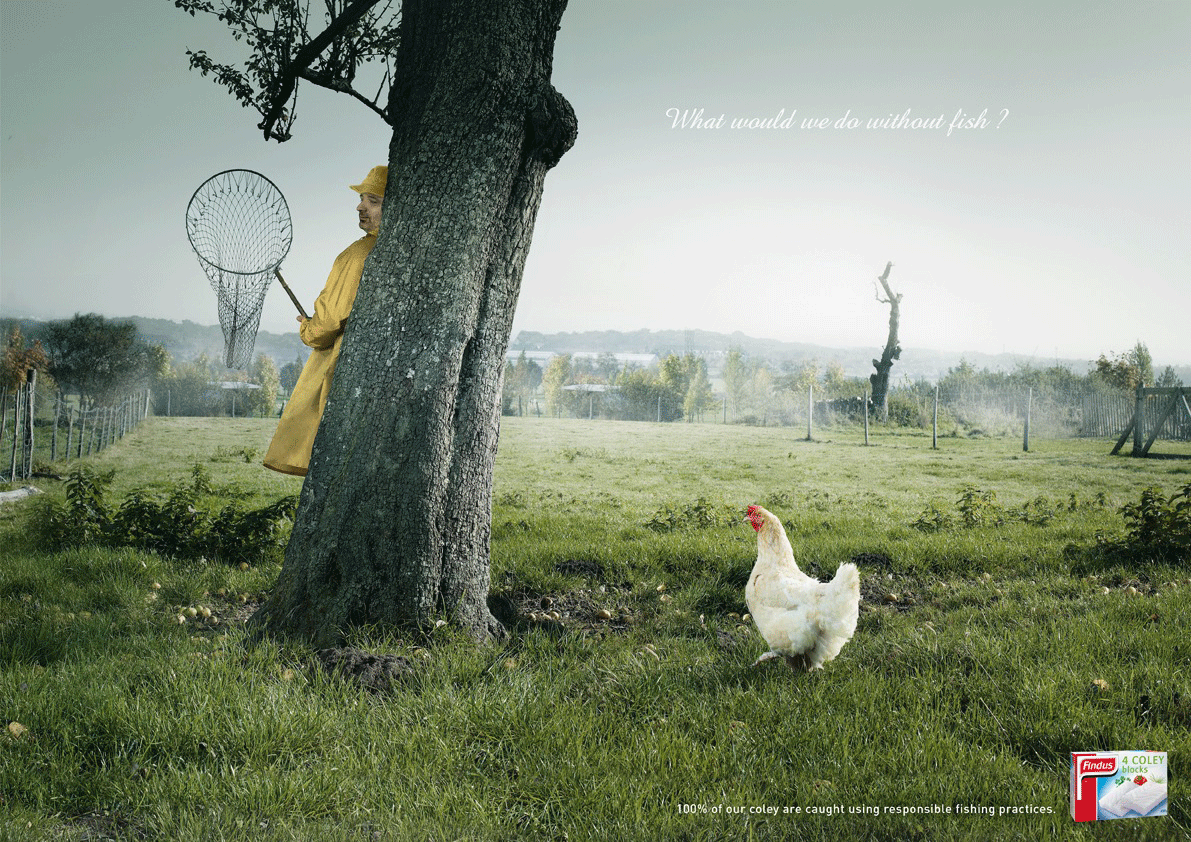 Рекламная кампания рыбных продуктов Findus от агентства Callegari Berville GreyЧто бы мы делали, если рыбы не существовало бы на свете? По мнению французского агентства Callegari Berville Grey, рыбаки стали бы охотится на других созданий, например, свиней, куриц или коров. Но благодаря рыбным продуктам Findus у них нет необходимости делать это.Надпись: "Что бы мы делали без рыбы? 100% нашей трески / угольной рыбы / лосося пойманы с помощью ответственных рыбацких методов." Агентство: Callegari Berville Grey, Франция Творческий директор: Andrea Stillacci Арт директор: J?r?me Gonfond Копирайтер: Yannick Savioz Иллюстратор: Keep Coul Фотограф: Ilario & Magali Художественное оформление: Juliette Lambert |