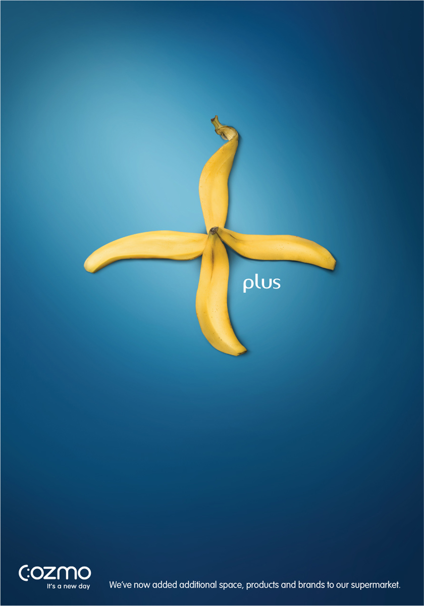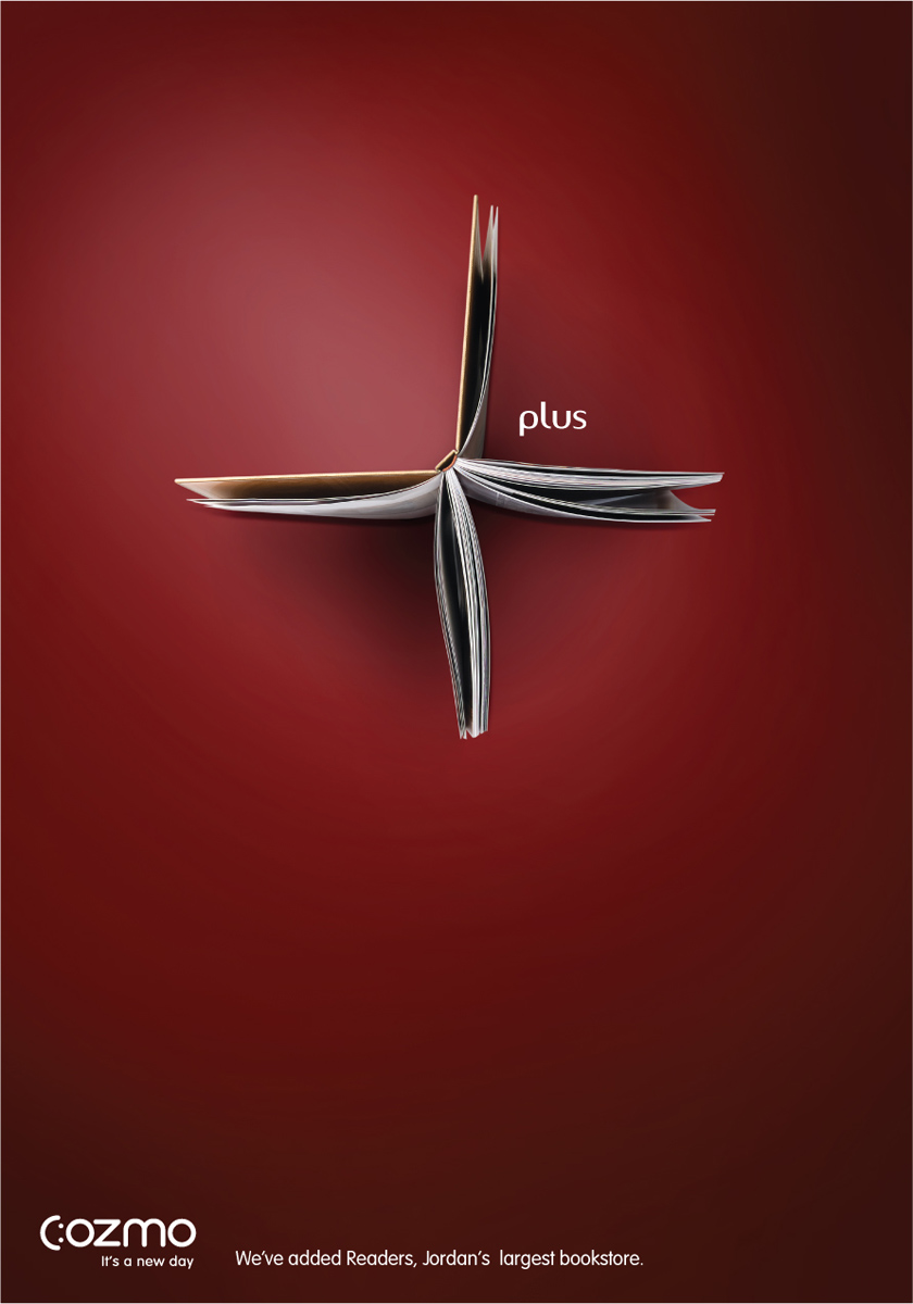Плюсы от супермаркета CozmoЧтобы показать потенциальным посетителям супермаркета Cozmo, что он увеличился, открыл новые секции, обновил линейку продуктов и брендов, агентство Team Y&R Amman просто показывает нам знак сложения "+", на всякий случай поясняя рядом, что это именно плюс.Надпись: "Теперь мы добавили дополнительную площадь, продукты и бренды в наш супермаркет. Теперь мы добавили Readers, самый большой иорданский книжный магазин. Теперь мы добавили Fakhr El-Din & Co. Заберите с собой секцию. Cozmo. Это новый день." Агентство: Team Y&R Amman, Иордания |