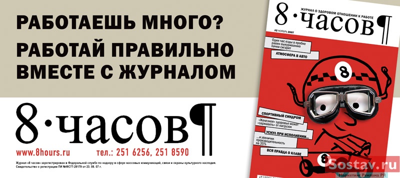 Журнал "8 часов" теперь в метрополитенеГлянцевый журнал для трудоголиков "8 часов", впервые вышедший в октябре, начал рекламную кампанию в московском метрополитене. С 10 ноября в 109 вагонах по кольцевой ветке будут размещены стикеры с обложкой ноябрьского номера. По словам PR-менеджера проекта Олеси Тепловой, с ноября журнал "8 часов" также появится в киосках Московского метрополитена.Учрежденный издательским домом "Арт-Сити" журнал печатается тиражом в 50 000 экземпляров в типографии "Август Борг" и продается в рознице по цене 65 рублей. Новинка позиционируется как первое издание, пишущее о правильном образе жизни на рабочем месте. Помимо печатной рекламы в метрополитене, до конца года будут транслировать радиоролики на радиостанциях "Европа плюс", "Best-FM" и "Радио 7". |