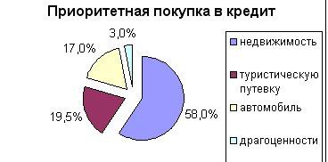 Взять кредит на отдых в случае нехватки собственных средств, готовы 25-30% респондентов. При ответе на вопрос о приоритетности покупки, на которую готовы взять кредит, мнения разделились следующим образом: большая часть потребителей (58%) в первую очередь готовы брать кредит на покупку недвижимости, затем, с отрывом практически в три раза, идет «туристическая путевка» и «автомобиль».