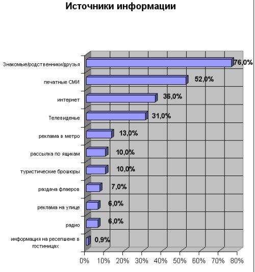 Самым популярным источником информации является «сарафанное радио», то есть на формирование мнения респондентов о тех или иных местах, организациях, предлагающих услуги и пр., в первую очередь оказывает влияние мнение их близких, друзей, знакомых. Каждый второй житель города, принимая решение о проведении отдыха, ориентируется на рекламную информацию, предлагаемую в печатных СМИ. Каждый третий в поиске информации ориентируется на телевидение и интернет.