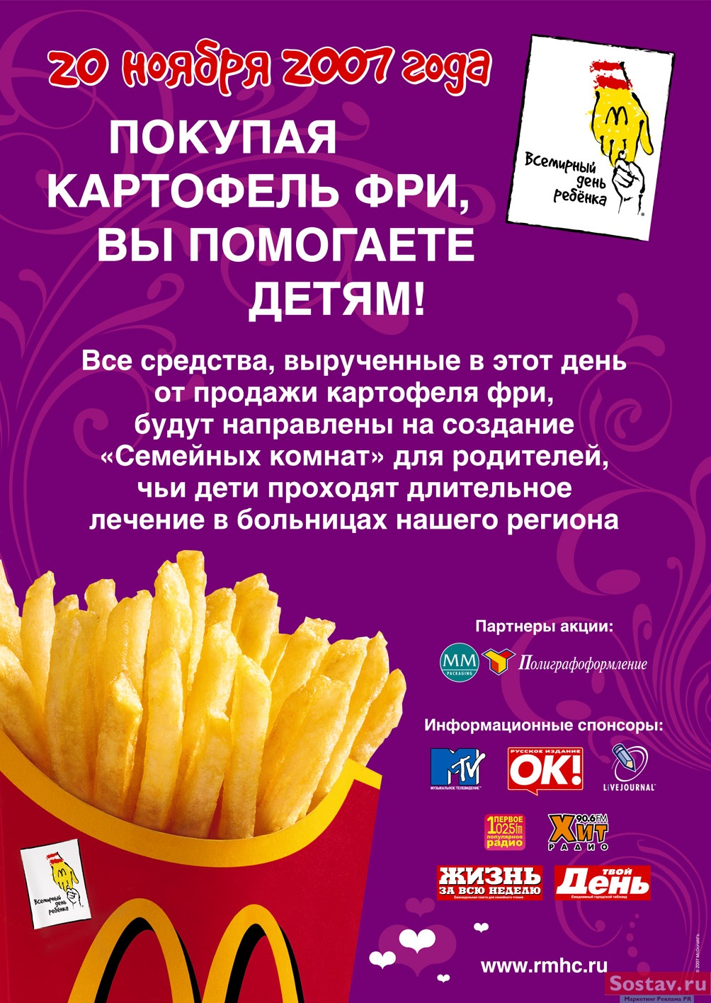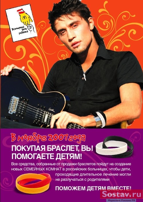 Традиционно в конце осени компания "Макдоналдс" проводит благотворительные акции, посвященные "Всемирному дню ребенка". В ноябре этого года в сети ресторанов продаются разноцветные браслеты. Кроме того, вся сумма, на которую 20 ноября посетители заведений приобретут картофель фри, будет также перечислена в Благотворительный фонд "Дом Роналда Макдоналда" на создание "Семейных комнат" в больницах. Благотворительная акция поддерживается рекламной кампанией, лицом которой стал Дима Билан. Агентство DDB Russia разработало спот, в котором певец играет на синтезаторе и поет больным малышам свой хит "Я знаю точно невозможное возможно". Действия разворачиваются в одной из "Семейных комнат", над увеличением числа которых работает компания