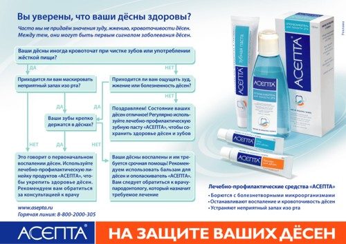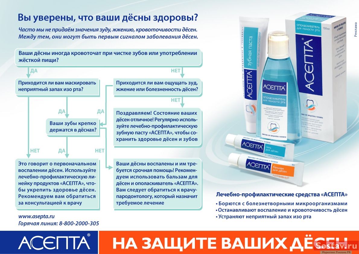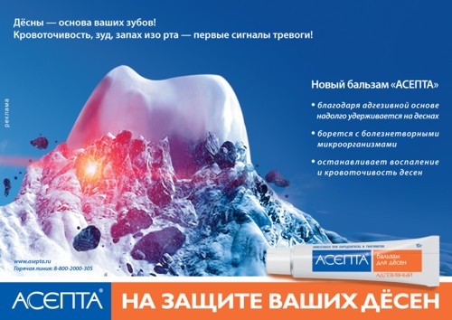 В поддержку бренда была запущена образовательная программа "Страна, которая улыбается", которая стартовала в известных телегидах Москвы и Санкт-Петербурга. Образовательный модуль призывает потребителя задуматься о проблеме. Несложная анкета, размещенная в модуле, информирует потребителя о первых и наиболее распространенных симптомах заболевания десен, на которые мы очень часто просто не обращаем внимания. Одновременно с прессой стартовал образовательный спецпроект в программе "Сегодня утром" на НТВ. В течение трех месяцев в рубрике "Здоровье" выходят образовательные сюжеты о методах лечения и профилактики заболеваний десен. В октябре под эгидой проекта "Страна, которая улыбается" стартовала совместная акция с "Русским Радио". Несложная механика радиоигры "Меняем улыбки на подарки!" позволила привлечь максимальное количество откликов среди желающих защитить десна от воспаления и сохранить зубы здоровыми. С конца октября на основных телеканалах в крупнейших городах России началось прямое размещение ТВ-ролика "АСЕПТА". Ролик закрепляет в сознании потребителя важную мысль: "Десны - это основа зубов". Ключевой имидж ролика - гора, олицетворяющая собой надежность основы. Здоровое спокойствие ее вершины - в наших руках. Параллельно осуществляется переход к ключевому имиджу и в печатном креативе. Образовательный модуль в телегидах сменяется имиджевым модулем, посвященным ключевому продукту линейки лечебно-профилактических средств - бальзаму "АСЕПТА". |